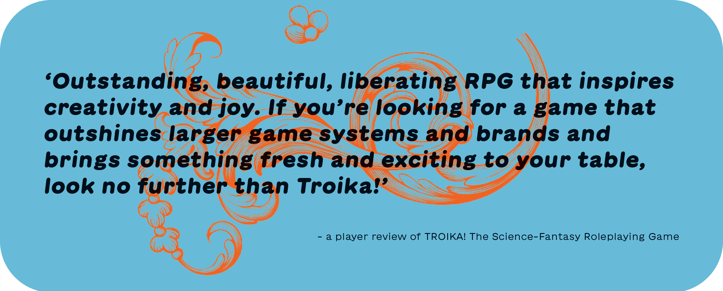 'Outstanding, beautiful, liberating RPG that inspires creativity and joy. If you're looking for a game that outshines larger game systems and brands and brings something fresh and exciting to your table, look no further than Troika!'
