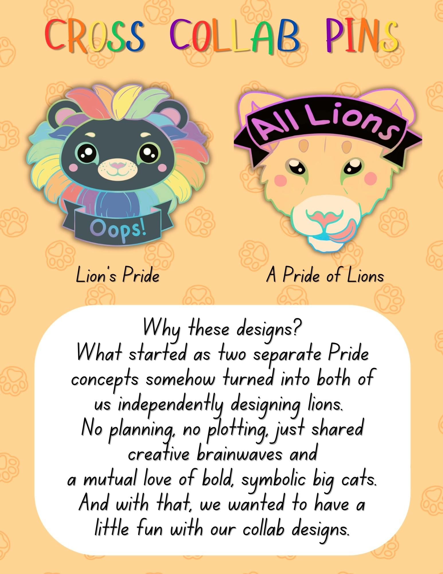 Lion’s Pride is a kawaii enamel pin collection celebrating courage, self-expression, and Pride in all its forms. Each pin features an adorable lion cub, symbolizing strength and confidence, with fluffy manes inspired by Pride flag colors.