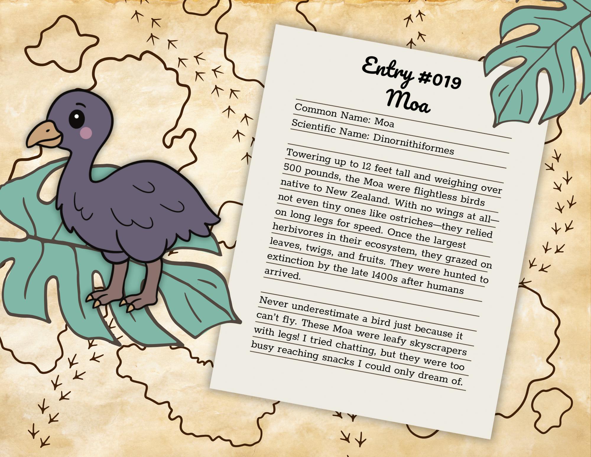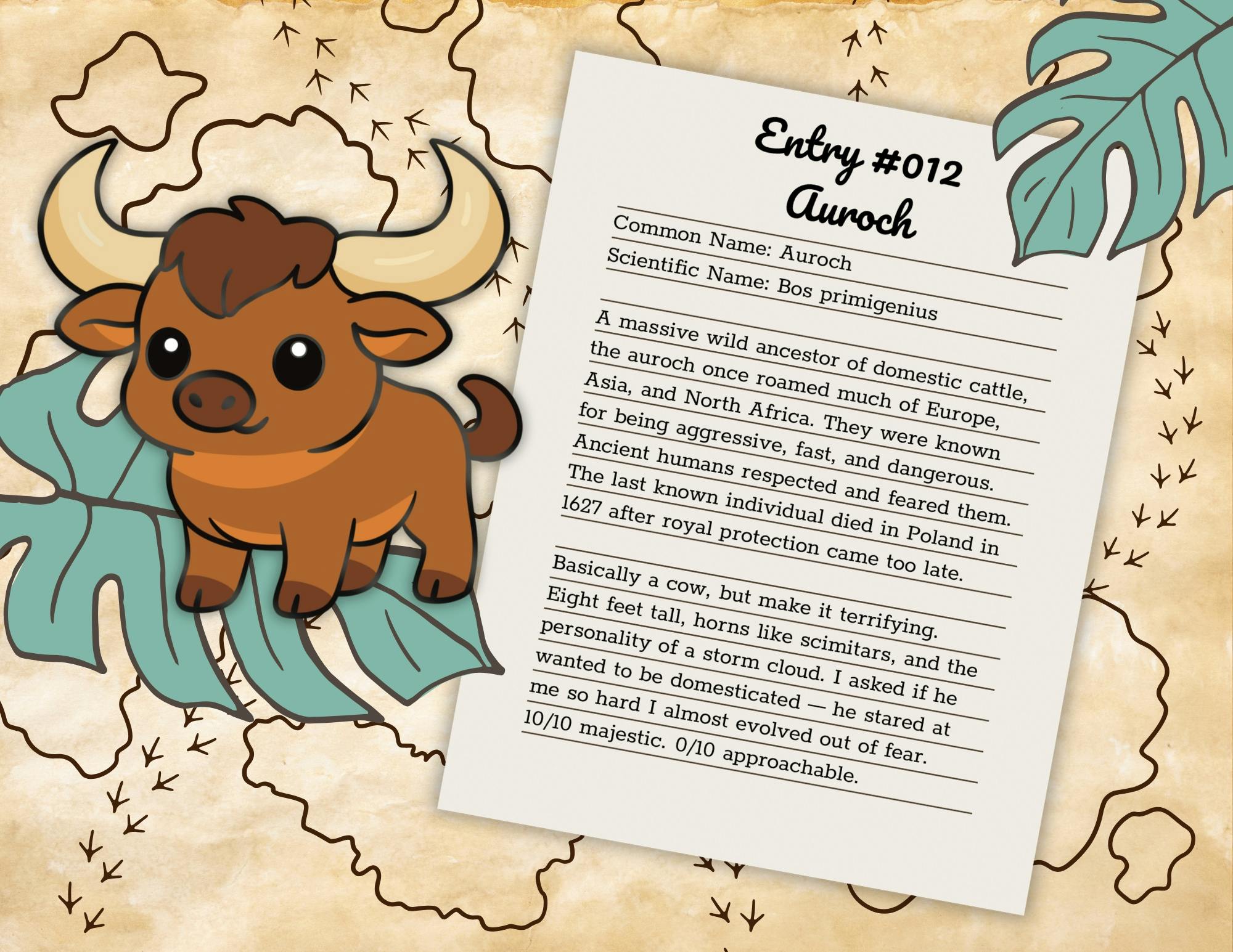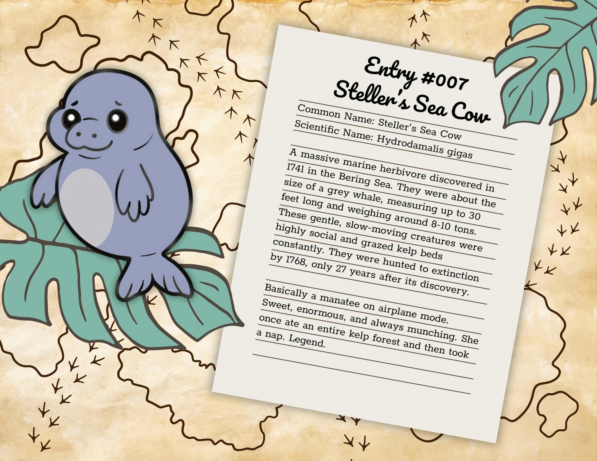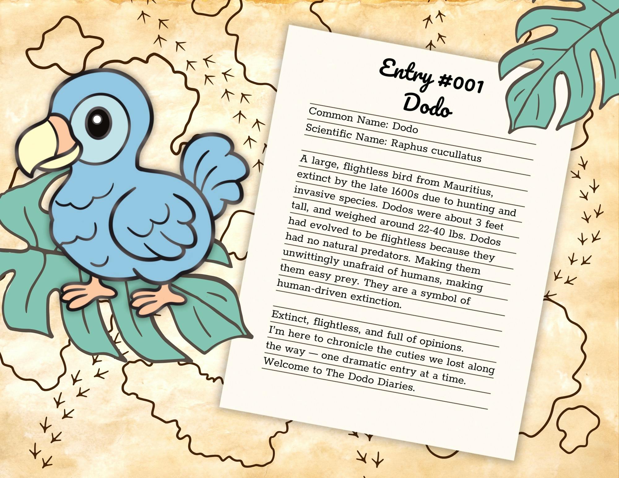 Below is a curated log of each species featured in The Dodo Diaries, preserved in enamel for future generations. Each entry includes the scientific name, key historical context, a glimpse into their natural past — and, naturally, the Dodo’s own highly personal field notes from his (often awkward) encounters.