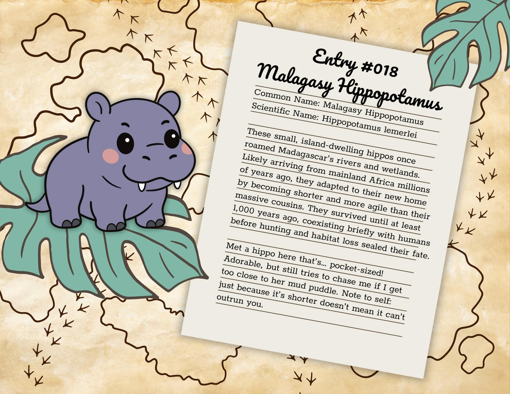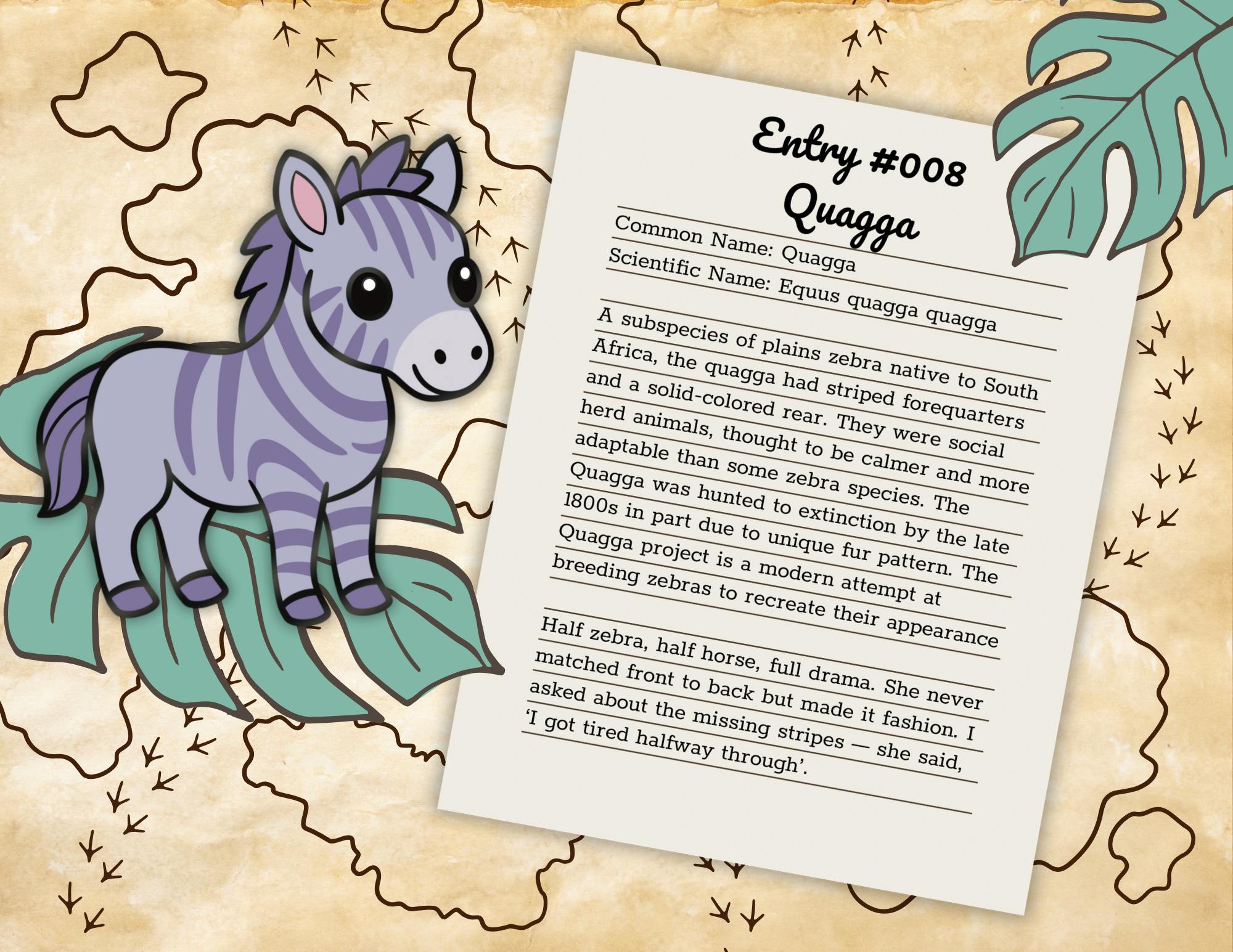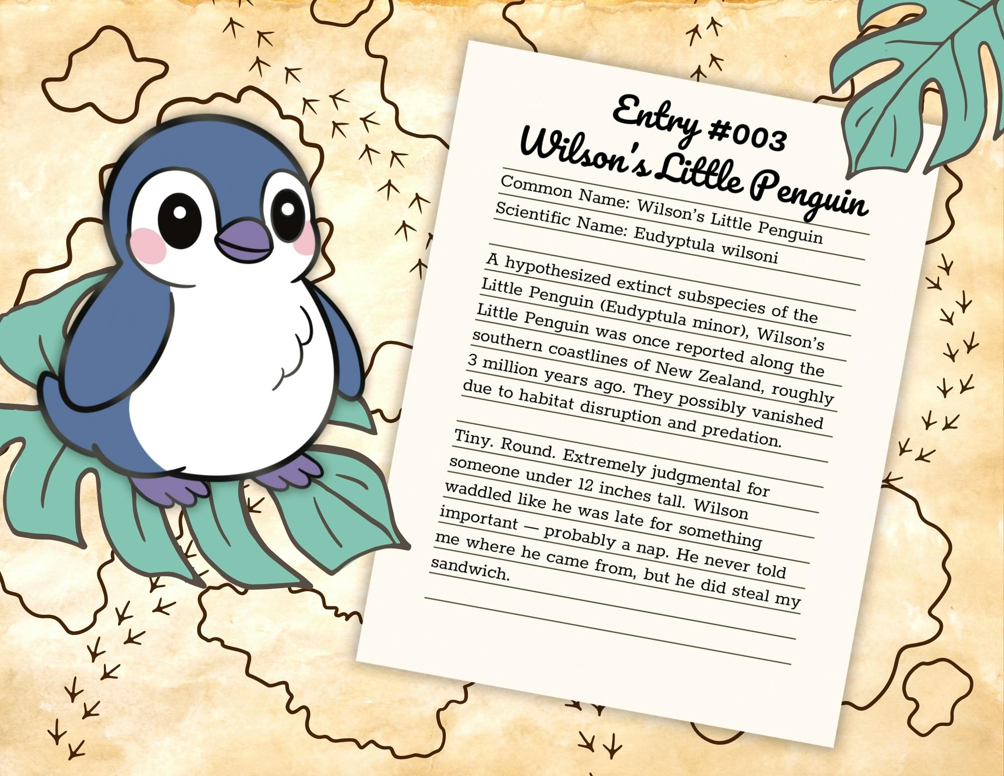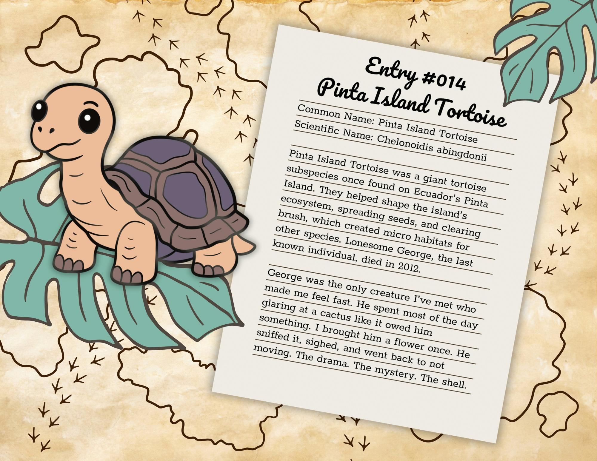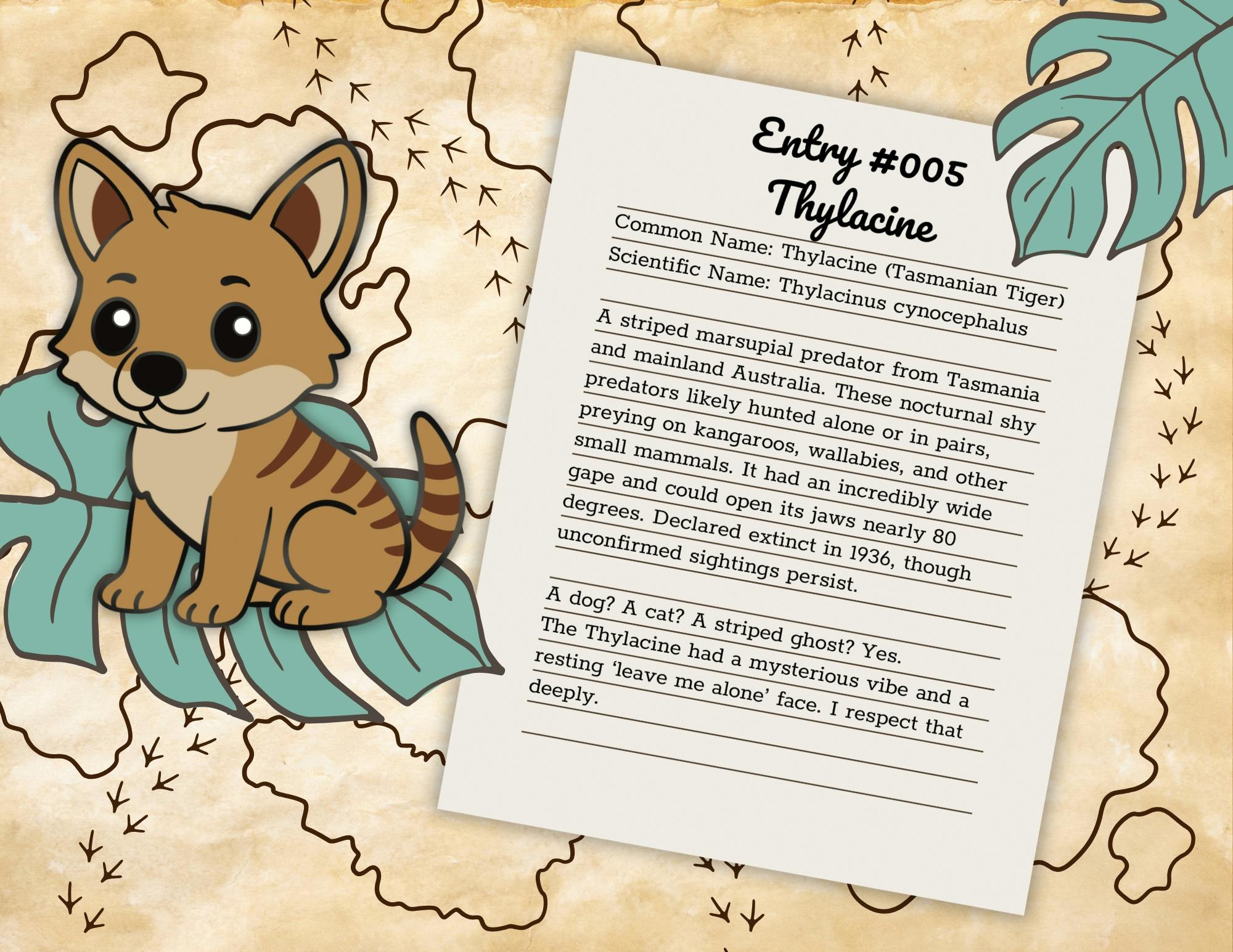 Below is a curated log of each species featured in The Dodo Diaries, preserved in enamel for future generations. Each entry includes the scientific name, key historical context, a glimpse into their natural past — and, naturally, the Dodo’s own highly personal field notes from his (often awkward) encounters.