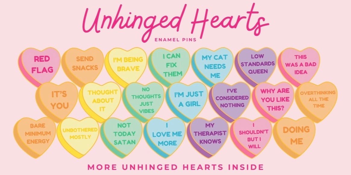 Sweet on the outside. Unwell on the inside. Unhinged Hearts turns classic Valentine candy icons into tiny enamel reminders that love is complicated. . . and sometimes you are too.