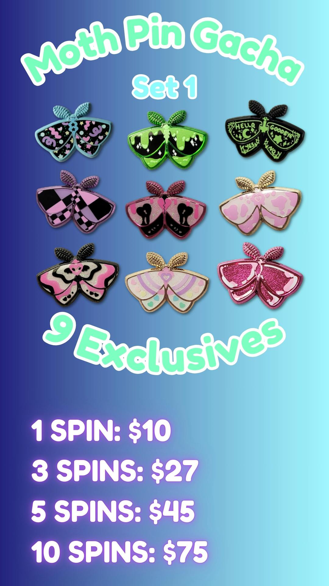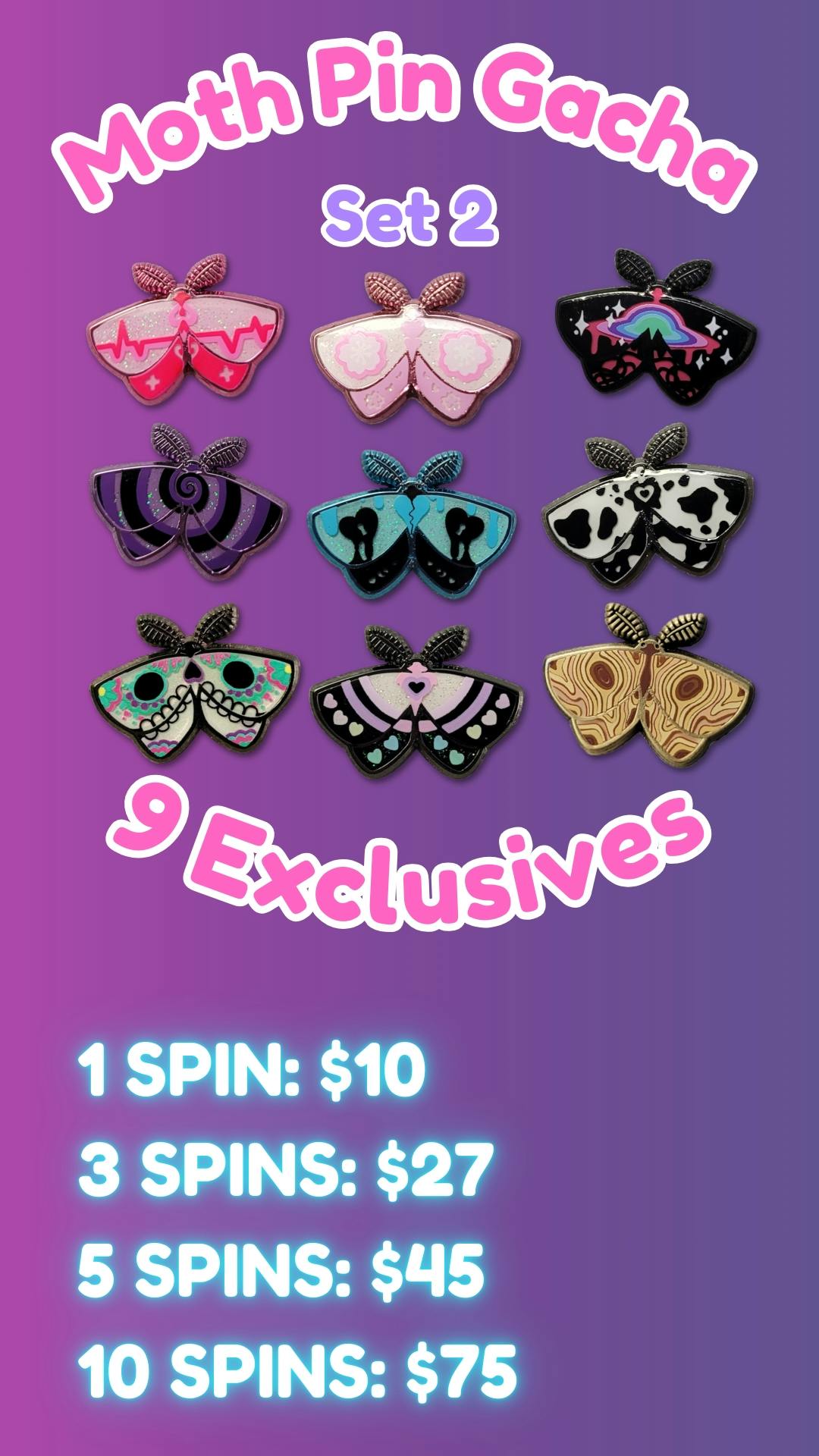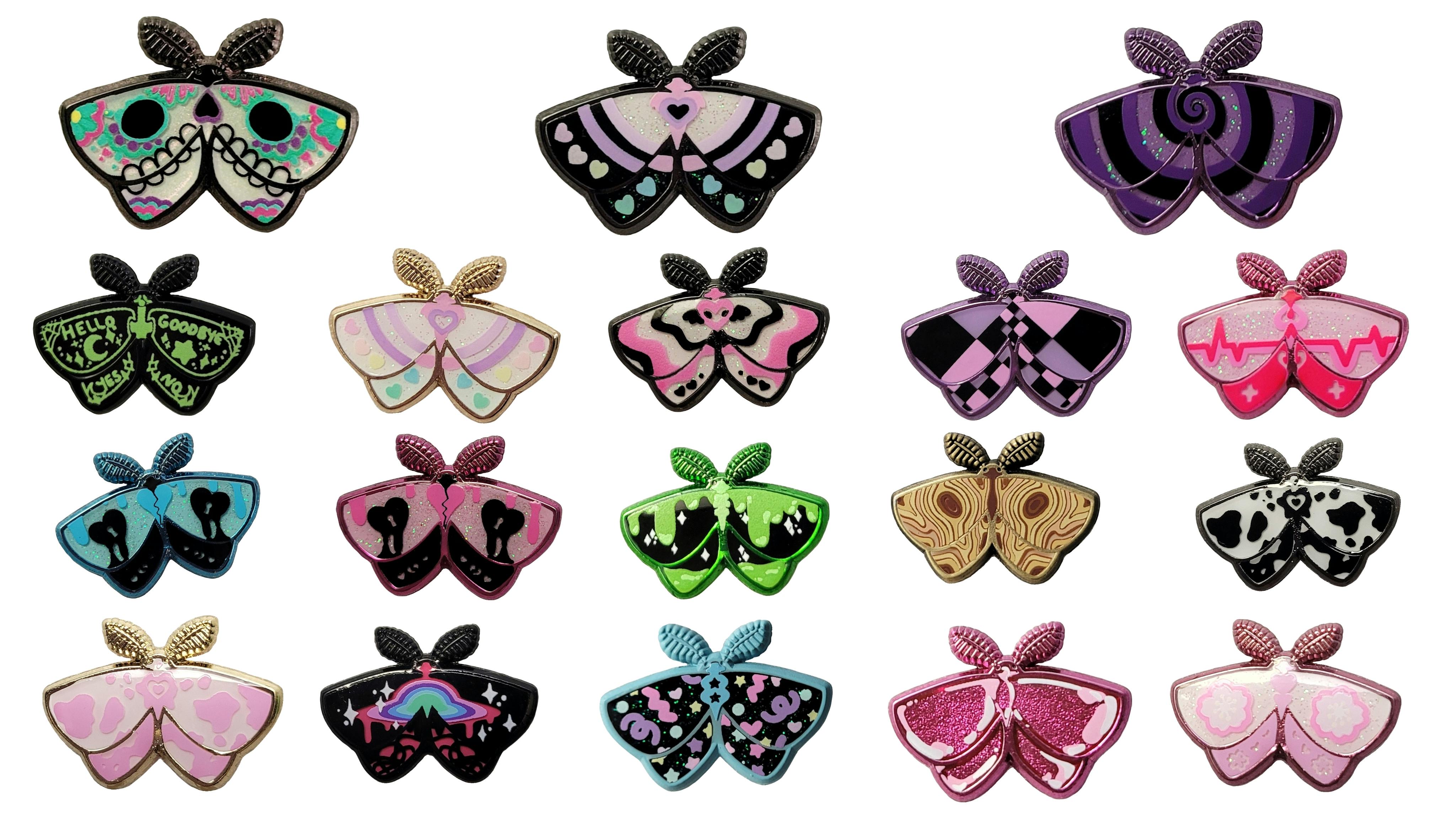 1) The preorder store for the cat paw pintopia campaign I just did is now open, and the moths with the previously-freebie pins looped into the machines are available to pledge for, if anyone had friends interested in getting them but missed the preorder store for this campaign. Since I am closing at the end of this year and my first in-person event is in May, I can't actually afford to keep the previously-freebie designs separated until in-person gacha spins.