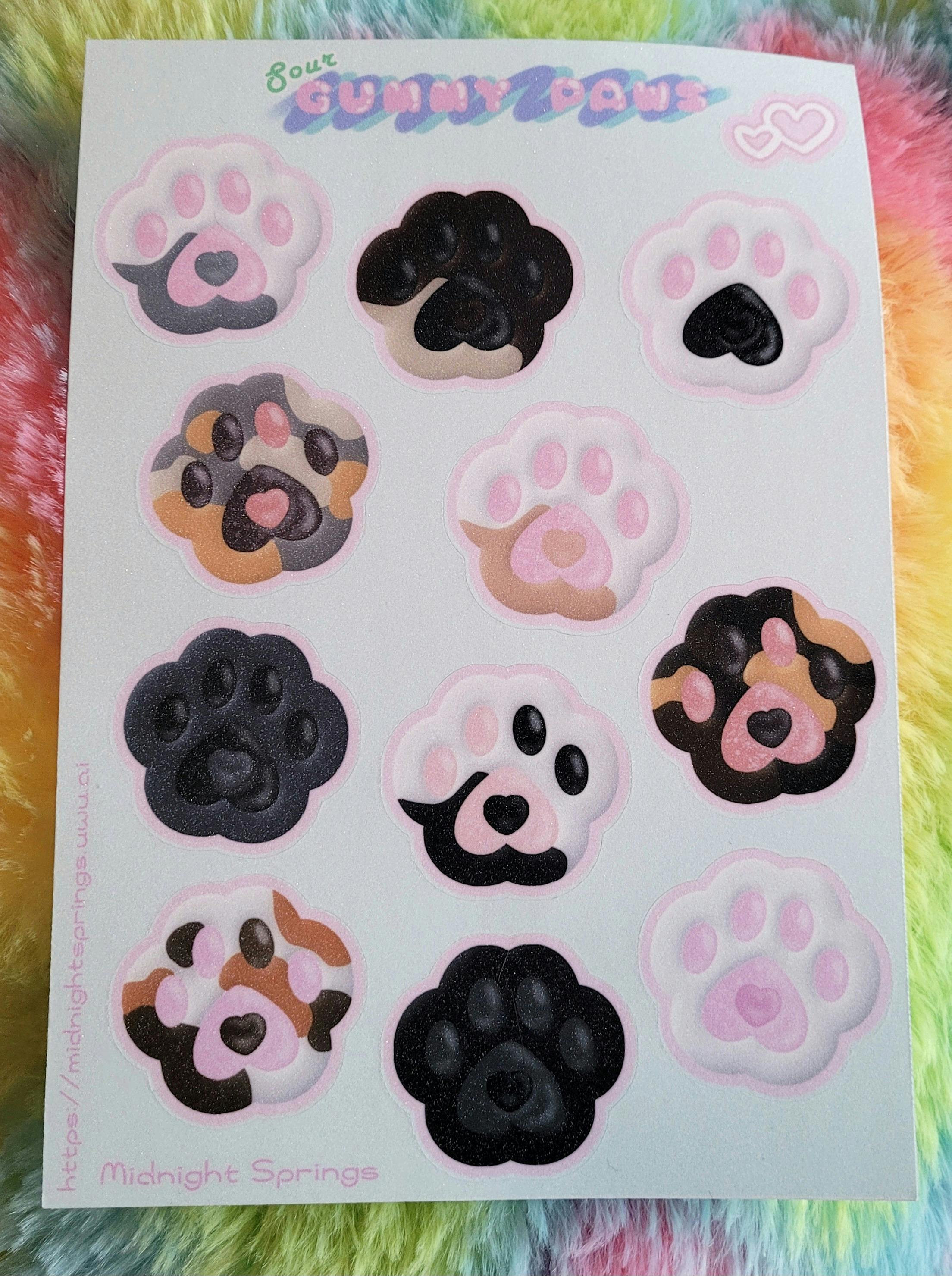 2) I got some glitter sticker sheets of the paws done as a test run with a 3rd person, because I have twice now been sent glitter stickers that are curling immediately upon receipt. These are fine! I need to adjust my cutlines but there's nothing wrong with them. I will be getting the moth graffiti sheets and taiyaki remade with this person too.