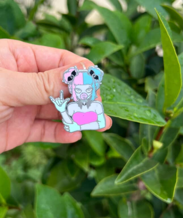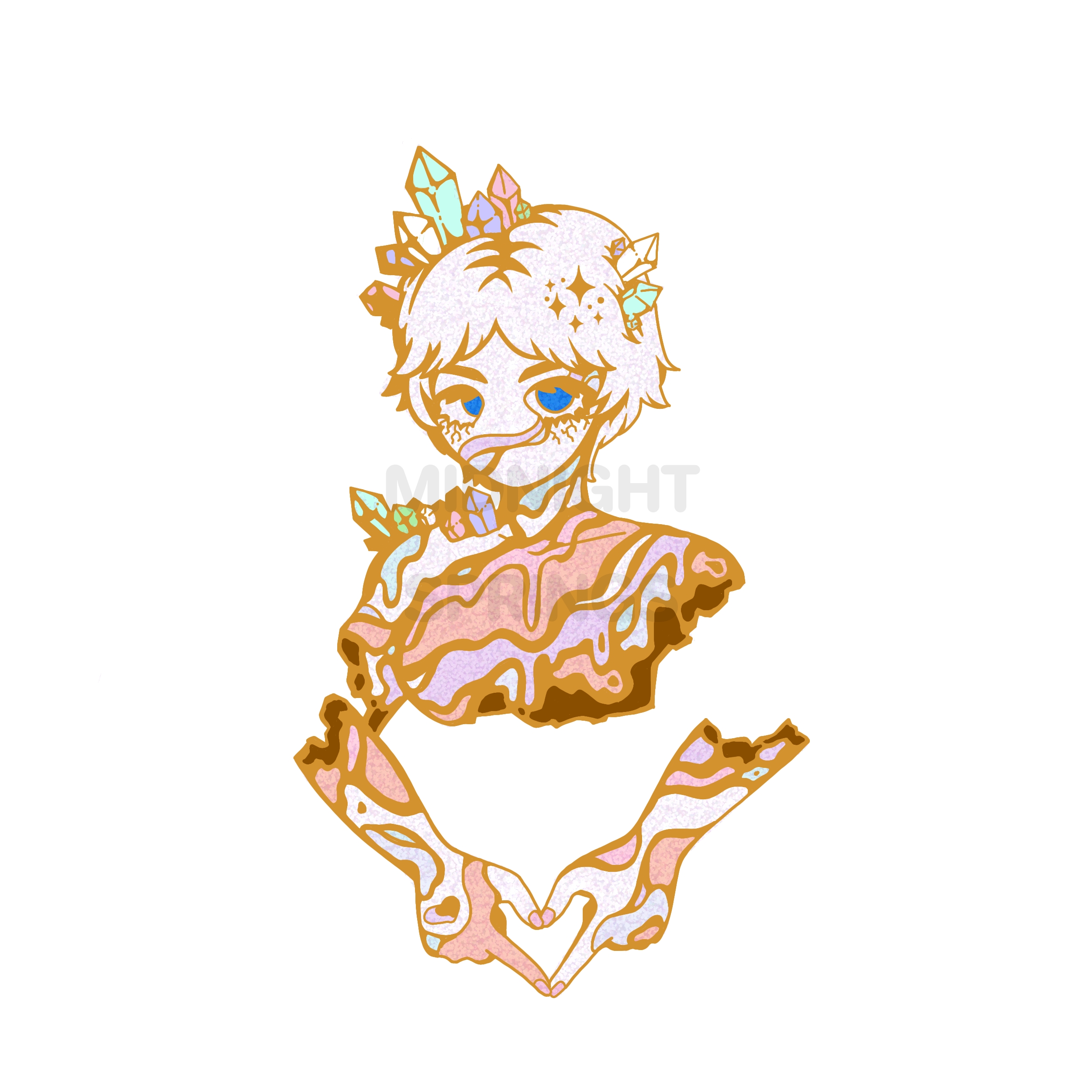 She will have fancy glitters! I want her to have a very geode-like existence, so her colors won't all be the same types of glitter, some will have thicker pieces. I don't think I communicated it well in the mockup but sampling her would be over $100 just for 1 pin and I can't do that out of pocket. ;;;;; If C is able to finish his designs in time for Oct 14th launch she will be the cross-collab reward on my end, but if not, she will be a goal.