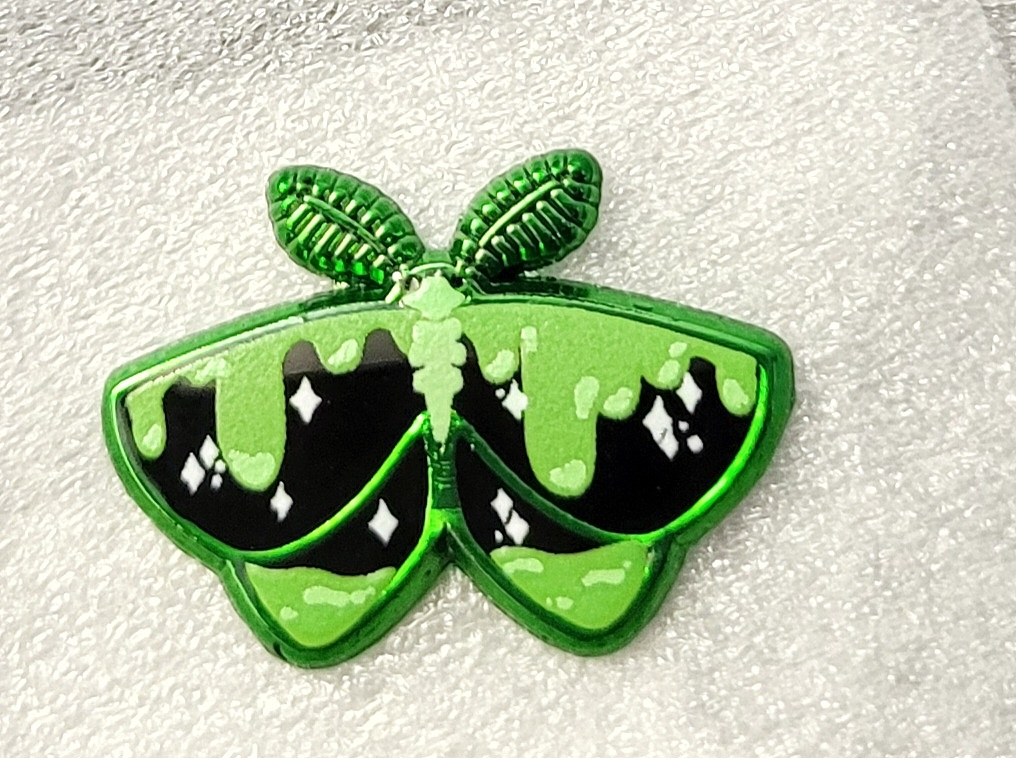 Which makes no sense, because glow powder is opaque and makes print thicker and grainy, yet they've shown me proof these do actually glow. Those of you that have my pins from before with glow print for sure know this (like ouija and ooze moths, lava lamp and cosmic horror fish, etc).