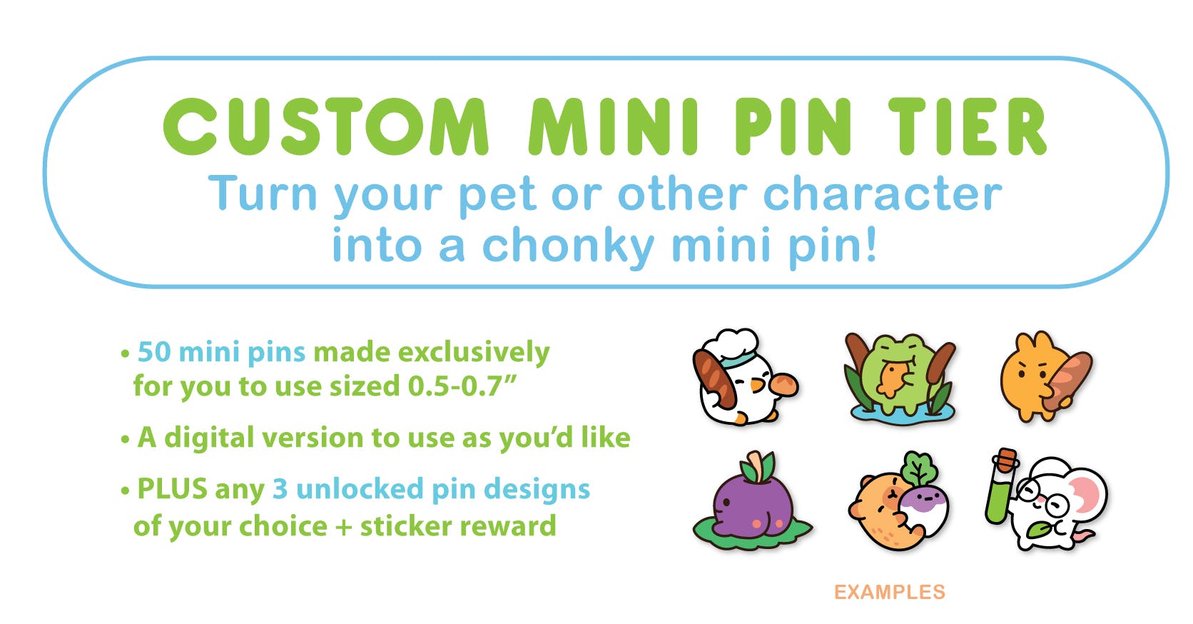 I've decided to add a CUSTOM MINI PIN TIER!Do you like the chonky mini pins I design? How about working one-on-one with me to create your own custom mini pin of your cute pet or character. You'll receive 50 mini pins (sized 0.5-0.7"). Keep them all or give them away to friends. These pins will never be reproduced. You'll also receive a digital version to use as an icon or avatar. PLUS you get to choose any 3 pins (includes the early bird sticker) from the campaign to add to this pledge!