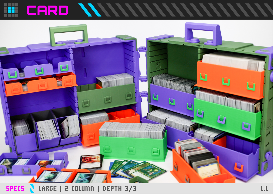 A fully modular composite system allows vertical and horizontal expansion for everything from cards to large minis and books.