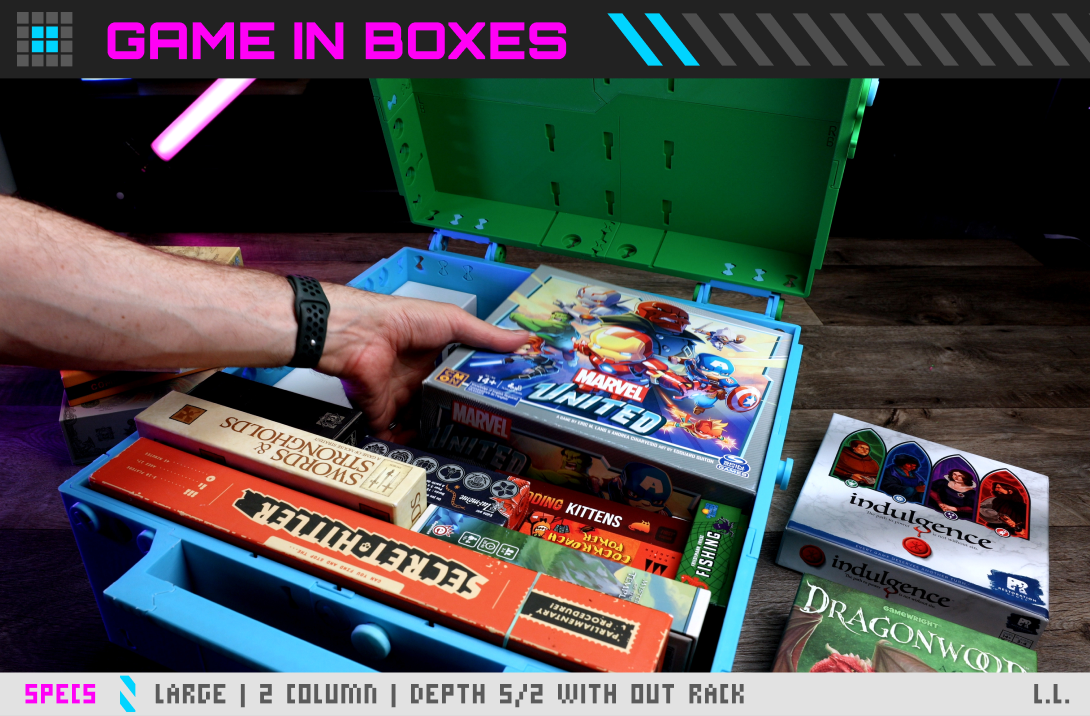 Modi Case supports board game box storage by providing modular compartments and shelving that can hold full game boxes, books, and large components in an organized layout.