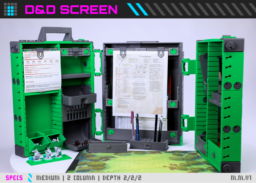 Modi Case can function as a customizable D&D screen, giving Dungeon Masters a structured command center to organize notes, dice, minis, and tools behind a modular layout. Its vertical panels and integrated storage keep everything visible. And of course, it has a built-in dice tower.