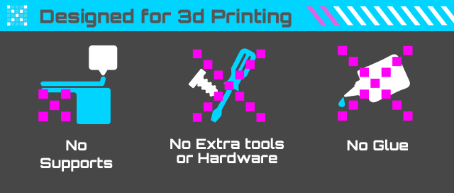 No glue, hardware, or supports required, with optimized print orientations.