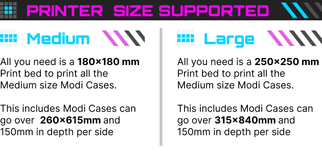 Modi Case has no fixed size and is built as a modular system that works across common FDM printer bed sizes. Users can expand it vertically or horizontally to create anything from small portable cases to large, fully customized tabletop command centers.