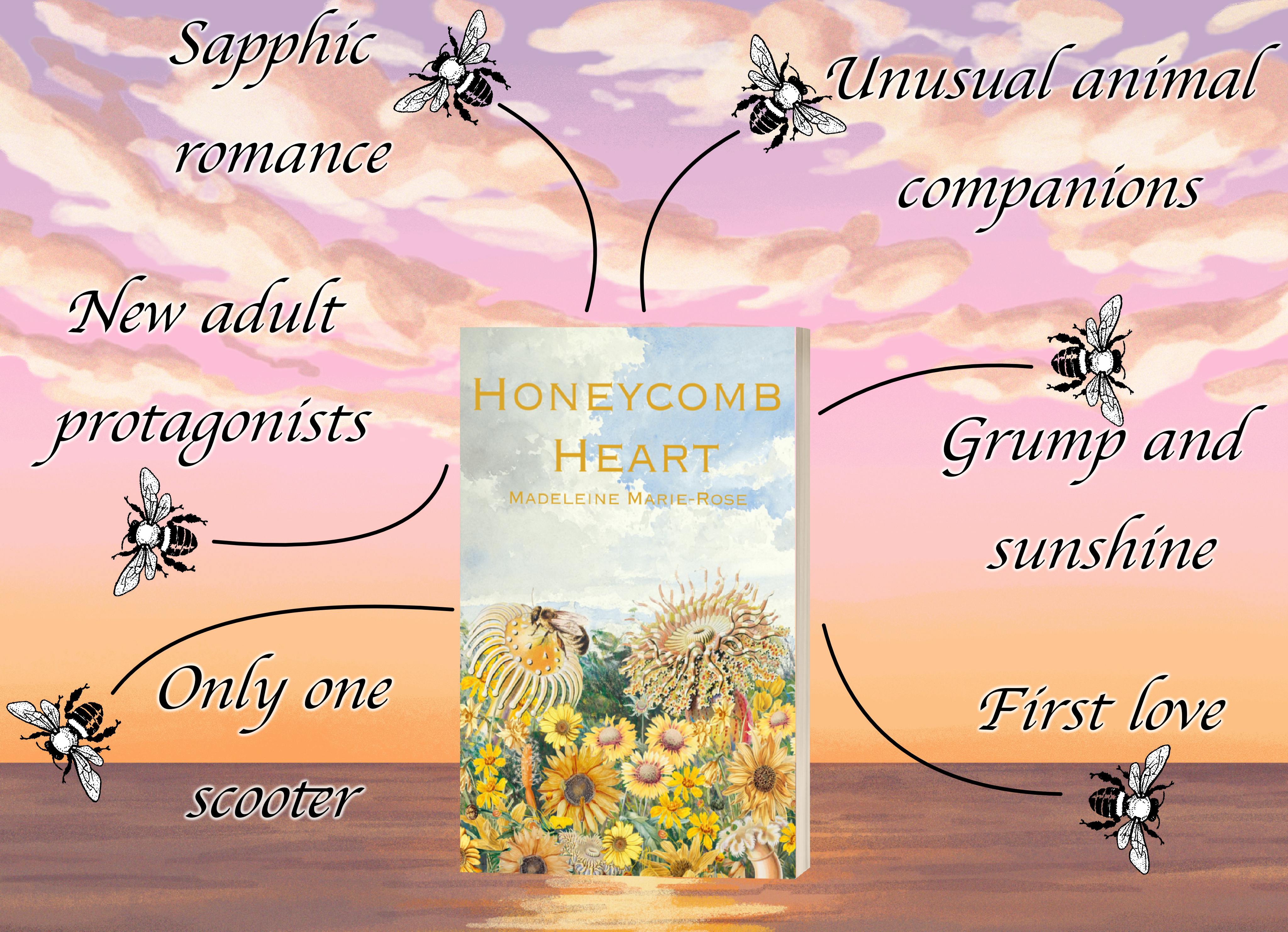 Launching November 12th, 2025, Honeycomb Heart will be released in ebook and paperback. Honeycomb Heart can be read as a standalone novel, but will have a sequel following the same characters in the near future. Join the campaign to fund its initial publication, get your name in the acknowledgments, and potentially unlock options for hardcover format, as well as other bee- and octopus-themed goodies…