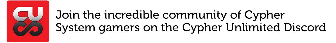 The 448-page Cypher System Rulebook, available now in print and PDF, gives you everything you need to power the campaign you want to run—any campaign—with the Cypher System: complete game rules, zillions of character options, equipment, creatures and NPCs, cyphers and artifacts, and great GM advice on adapting the Cypher System to a variety of settings.