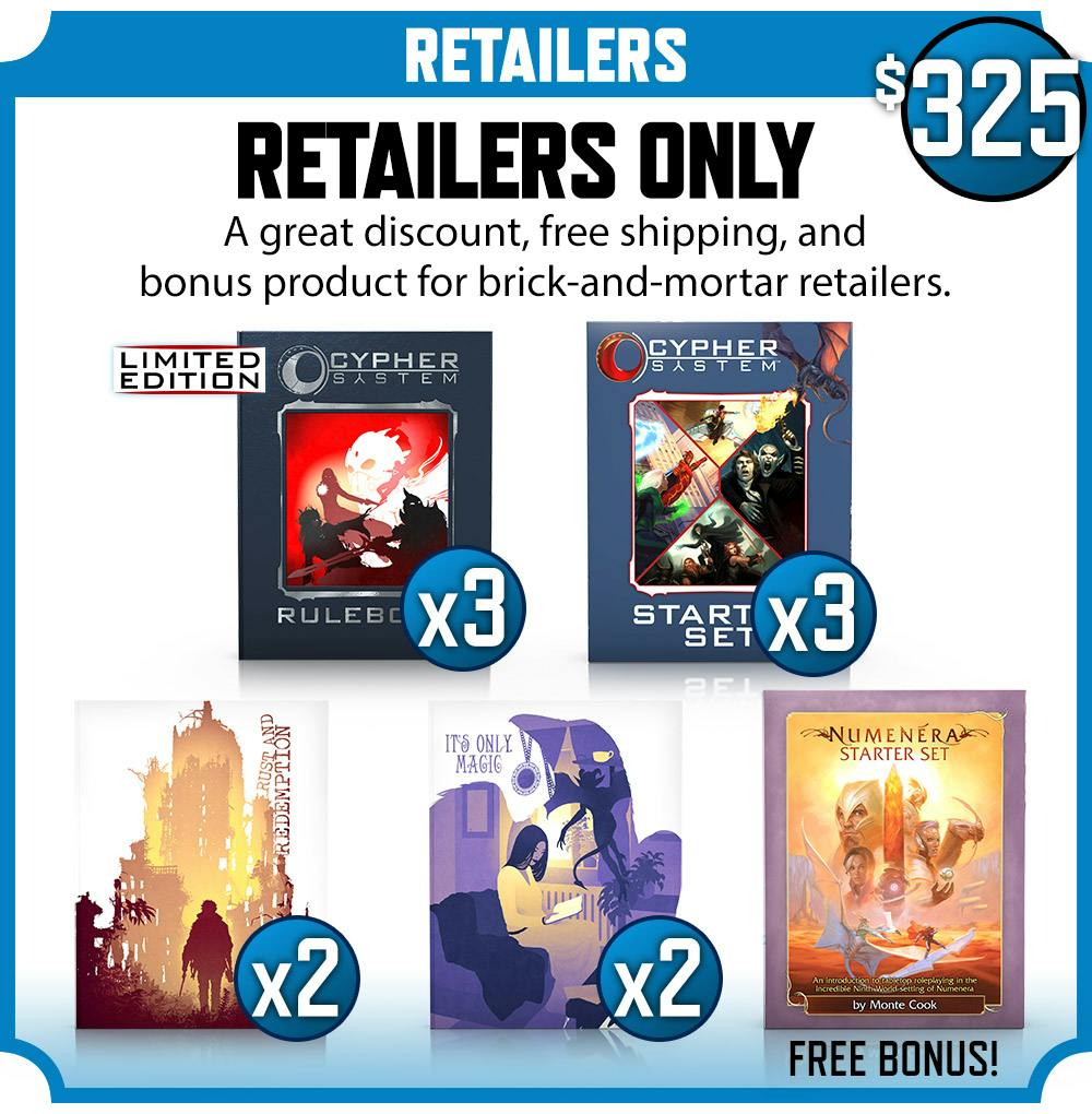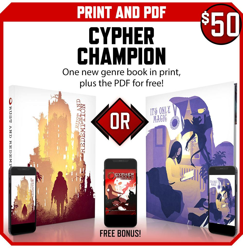 Don't have the Cypher System Rulebook? Every pledge level includes the 448-page Cypher System Rulebook in PDF, delivered early, for free!