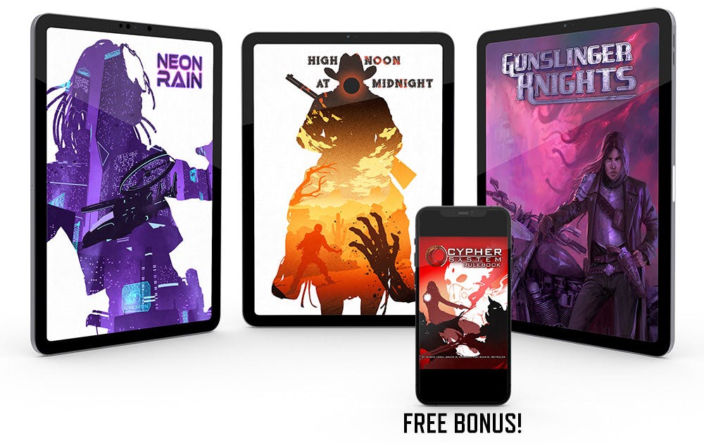 Strike out on dangerous missions against the megacorps, drift the dark high plains, or stand fast against storm-borne horrors. This backer level expands your Cypher System library with PDFs of all three of our new titles: Neon Rain, High Noon at Midnight, and Gunslinger Knights. Plus you get the Cypher System Rulebook in PDF, delivered early.