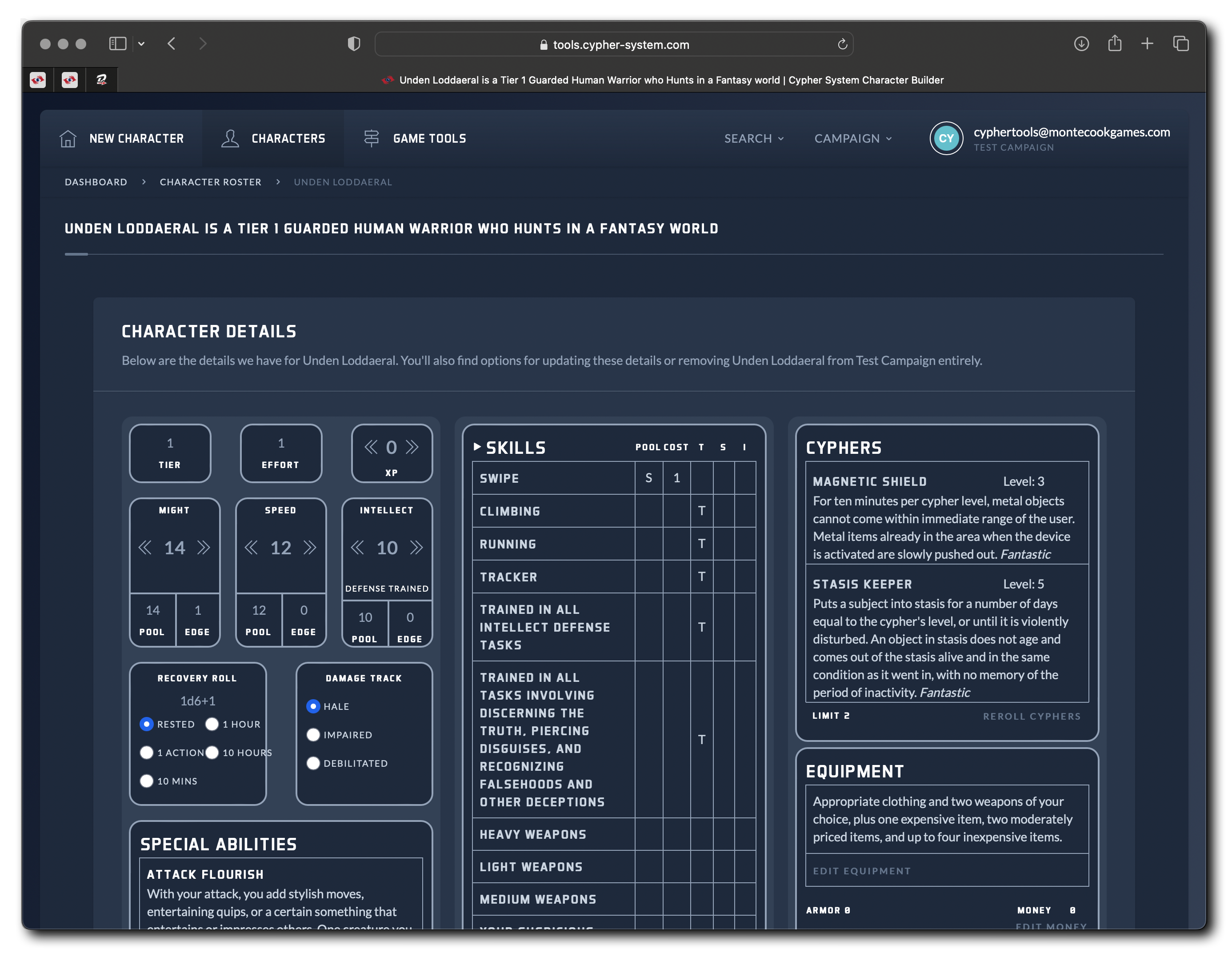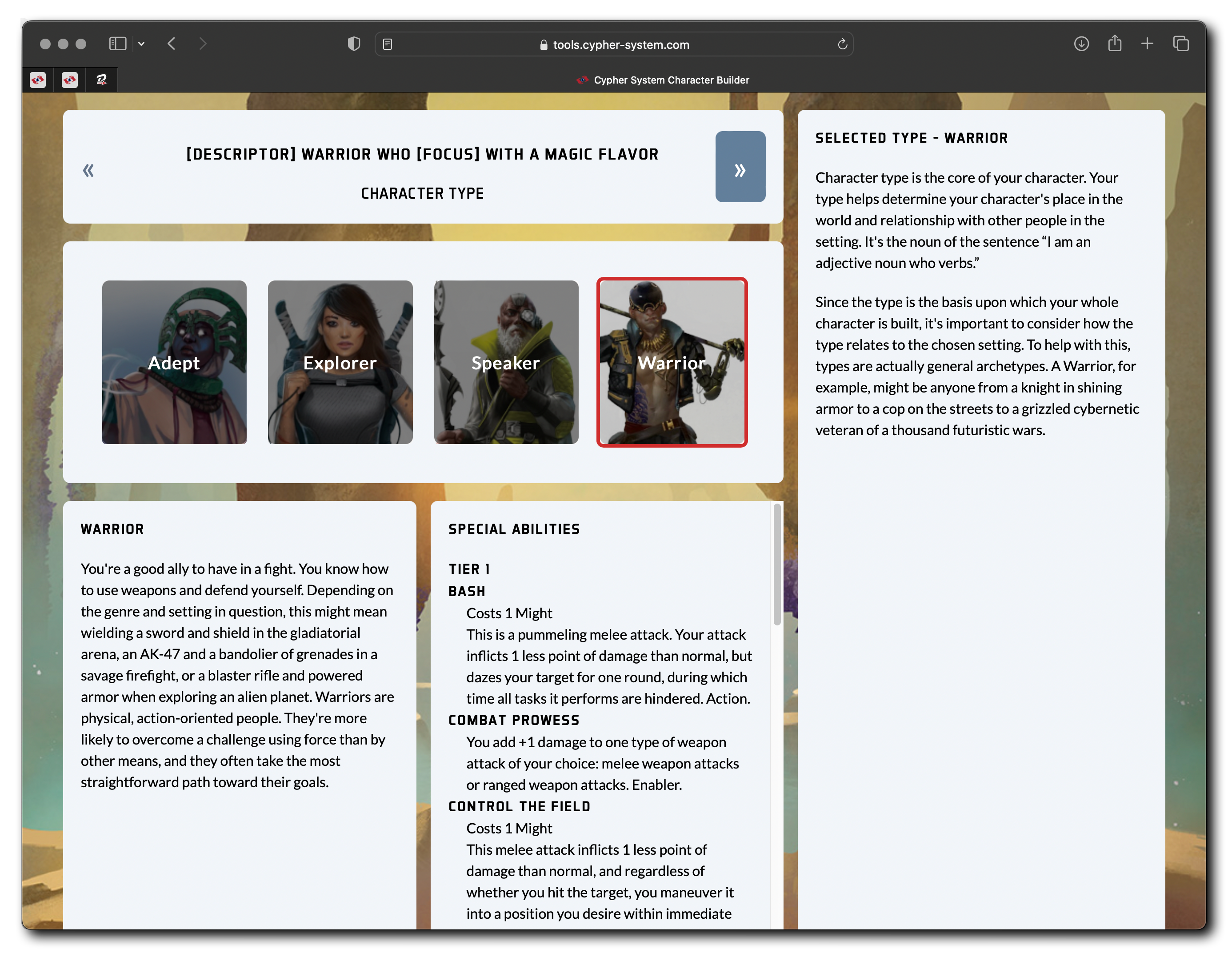 You can build, store, advance, maintain, edit, and even share Cypher System characters online with this free resource. There are multiple modes for creating characters—the Guided mode, in particular, is super fast and easy. It takes you through the process step-by-step. You can build a character in literally three or four minutes. (It’s pretty self-explanatory, but you can learn more about how it works with this article.)