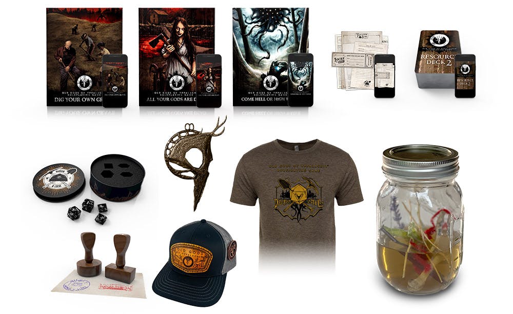 🎴 Old Gods of Appalachia Resource Deck 2 📜 Old Gods of Appalachia Prop Set 🎲 Old Gods of Appalachia Dice Set with Tin 📑 Stamp Set 📿 Jack's Fate Pendant 🧢 Deeper Still Hat 👕 Deeper Still T-shirt 🫙 Witch Jar