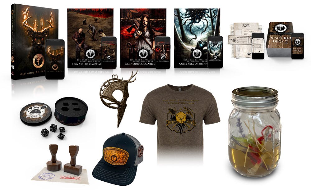 🎴 Old Gods of Appalachia Resource Deck 2 📜 Old Gods of Appalachia Prop Set 🎲 Old Gods of Appalachia Dice Set with Tin 📑 Stamp Set 📿 Jack's Fate Pendant 🧢 Deeper Still Hat 👕 Deeper Still T-shirt 🫙 Witch Jar
