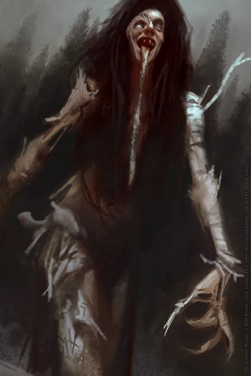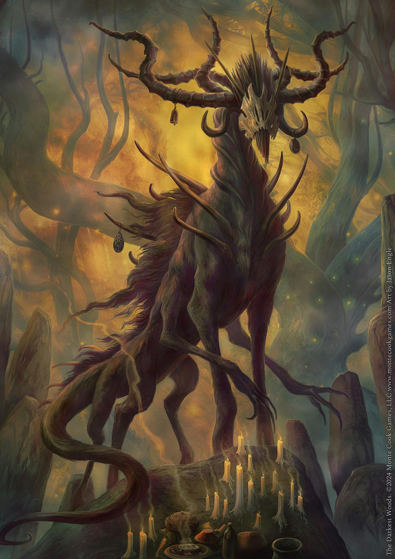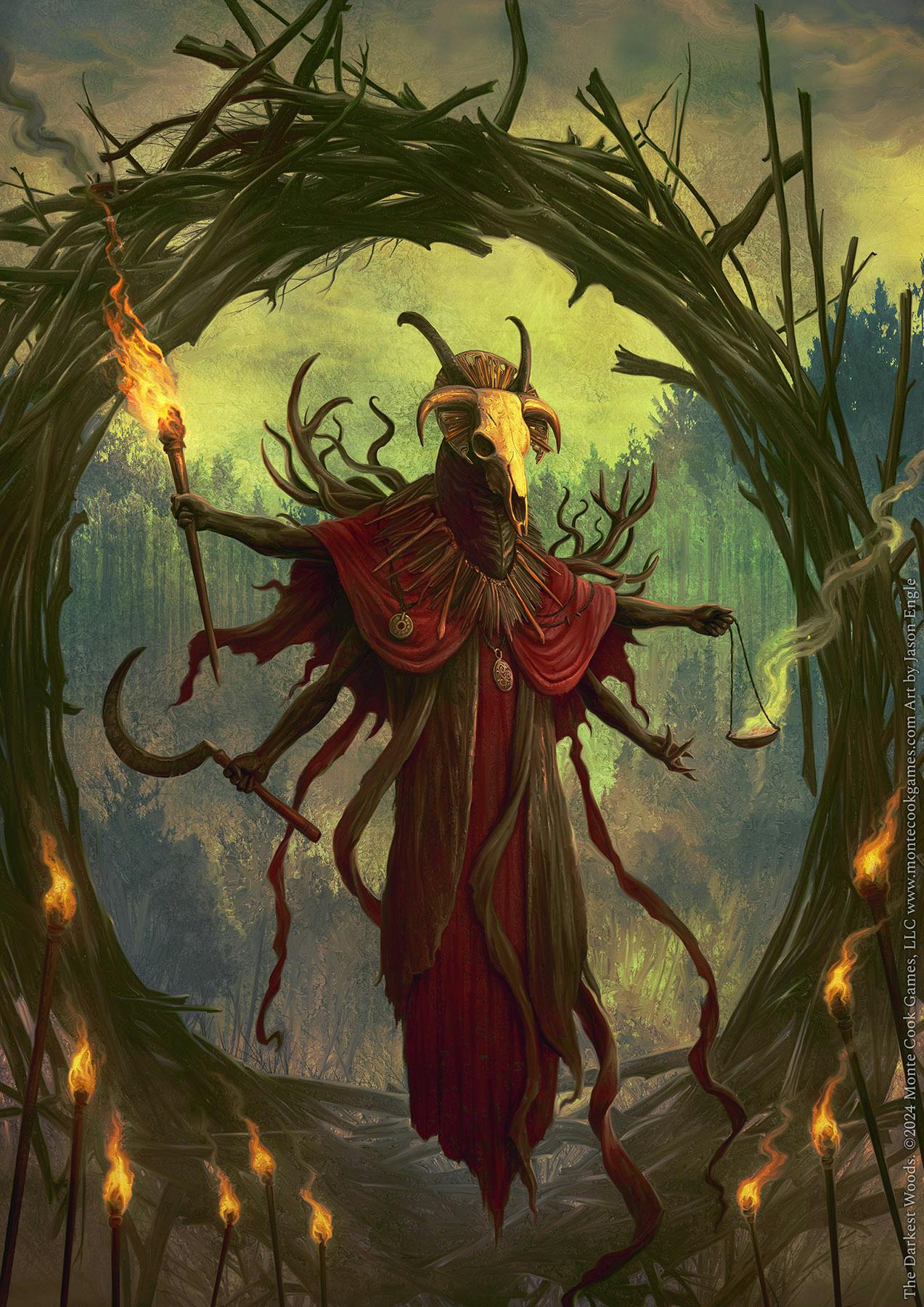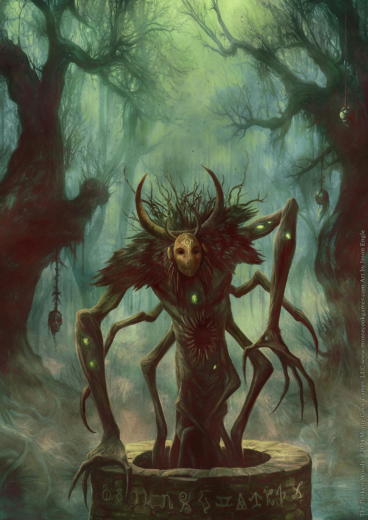 Mythic witches, horrific monsters, hateful spirits, cannibalistic cultists, and other dangers have always called the Darkest Woods home. But even the cruelty of the woods in winter, of a burning forest filled with charred ghosts, of a region haunted by things churned up in a flood, or of the truly twisted inhabitants of the Backwoods will test the mettle of any who find themself lost within the Woods' dusk-dark, twisted paths.