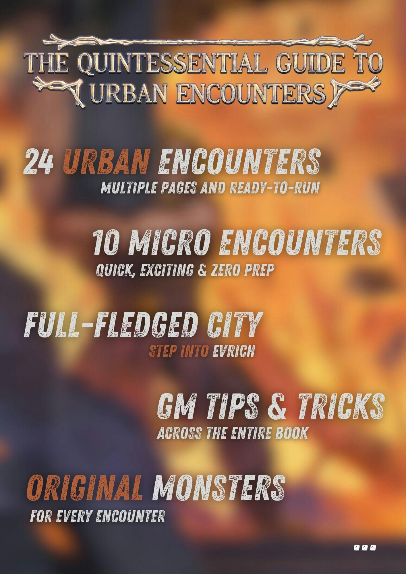 Starting with the design philosophy of the first book, Monster Encounters, we want to offer you everything you need to fill your urban campaign with exciting encounters, NPCs, intrigue and much more.
