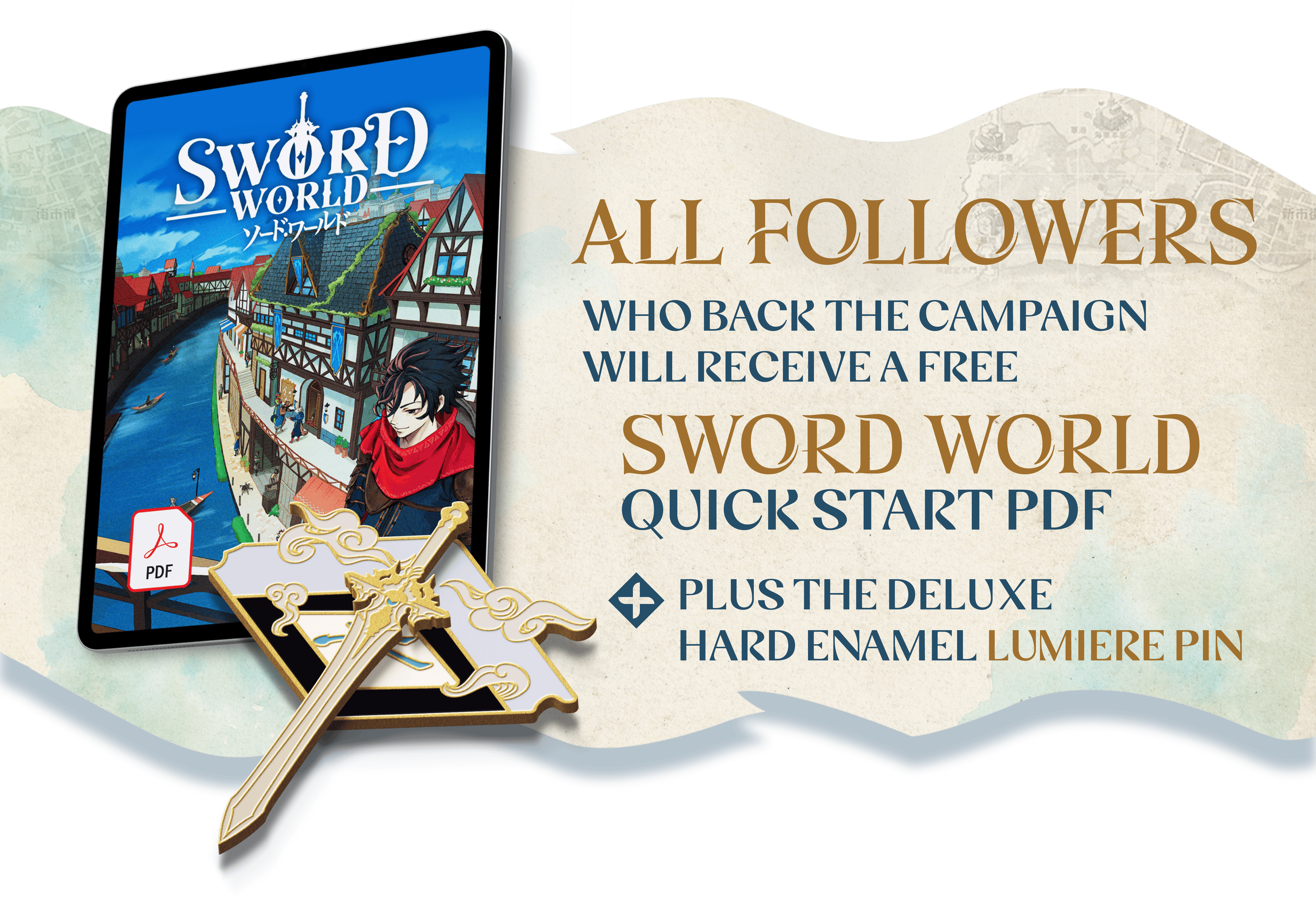 We're on an epic adventure to bring Sword World to English for it's first-ever official translation, and we're so glad you're here! Because you followed the campaign, you've earned your first of the 3 Swords of Genesis pins! Next, you can earn the Cardia pin by reserving your pledge.