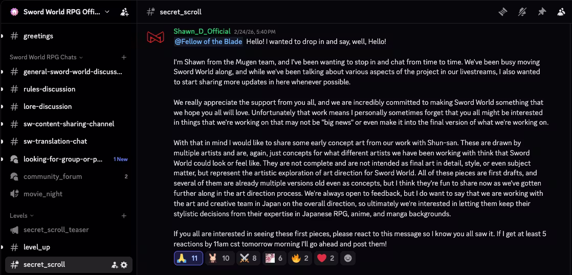 If you haven't heard already, the Secret_Scroll is a channel on our Discord server that gets to see everything we're sharing here and on social media FIRST. Before anyone else. They have already seen these concept images. If you would like to be in the Secret_Scroll, all you have to do is join our Discord server and start leveling up by being active and completing quests for XP. Once you get to level 15, you'll become a Fellow of the Blade, which will grant you access to that Secret_Scroll channel.