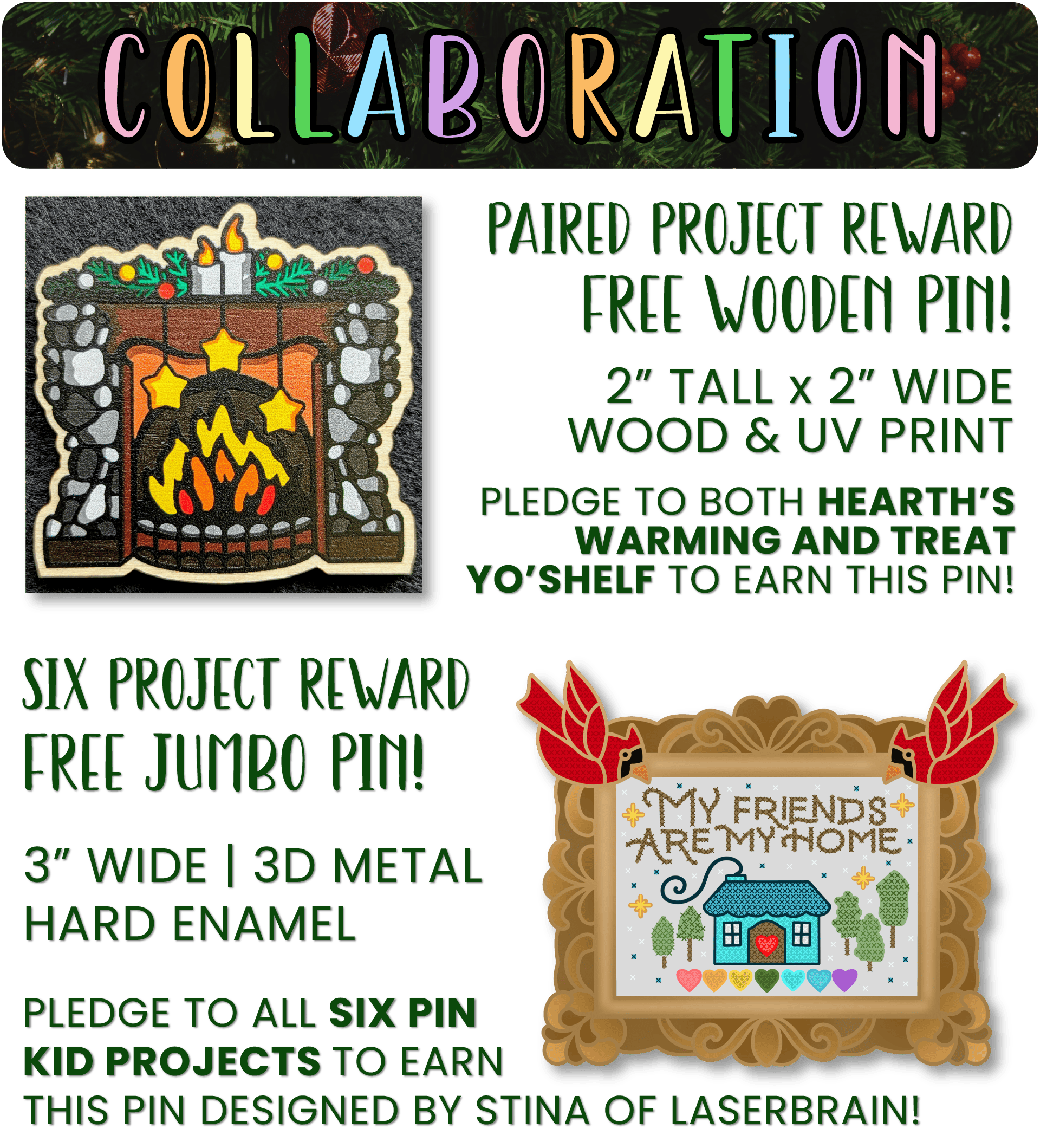 Pledging to two paired projects means free rewards! Pledge to Hearth's Warming and Treat Yo'Shelf to earn a free pin from both creators. And if you back all six projects, you’ll receive an exclusive free JUMBO pin — a perfect reward for supporting the entire collective that will go beautifully with the paired freebies! That means you can earn SEVEN free pins!