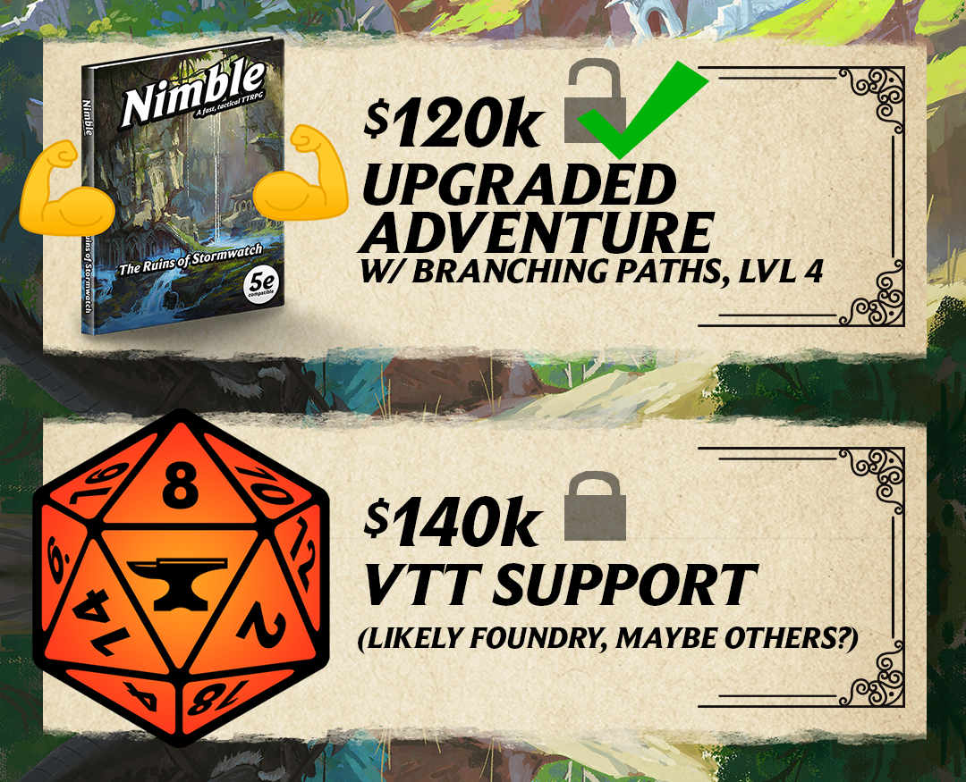 Next up at $140k, is exploring VTT support! We're still in the very early stages, there are a lot of moving parts, and no guarantees when it comes to 3rd party platforms and custom software developmentβBUT things are looking good. I'm already doing some exploratory work on having a Foundry module created with an experienced Foundry developer with a track record of delivering.