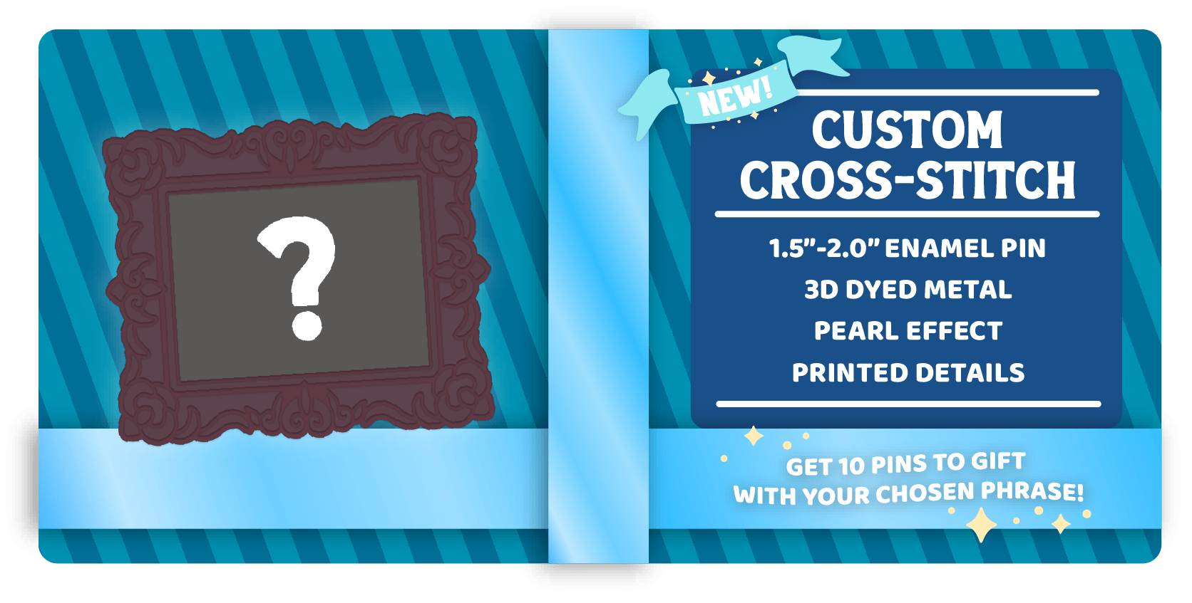 Choose one of our 3D dyed metal frames and have your custom phrase printed as a cross-stitch pin! You'll receive ten (10) pins with your custom design to share as you please.