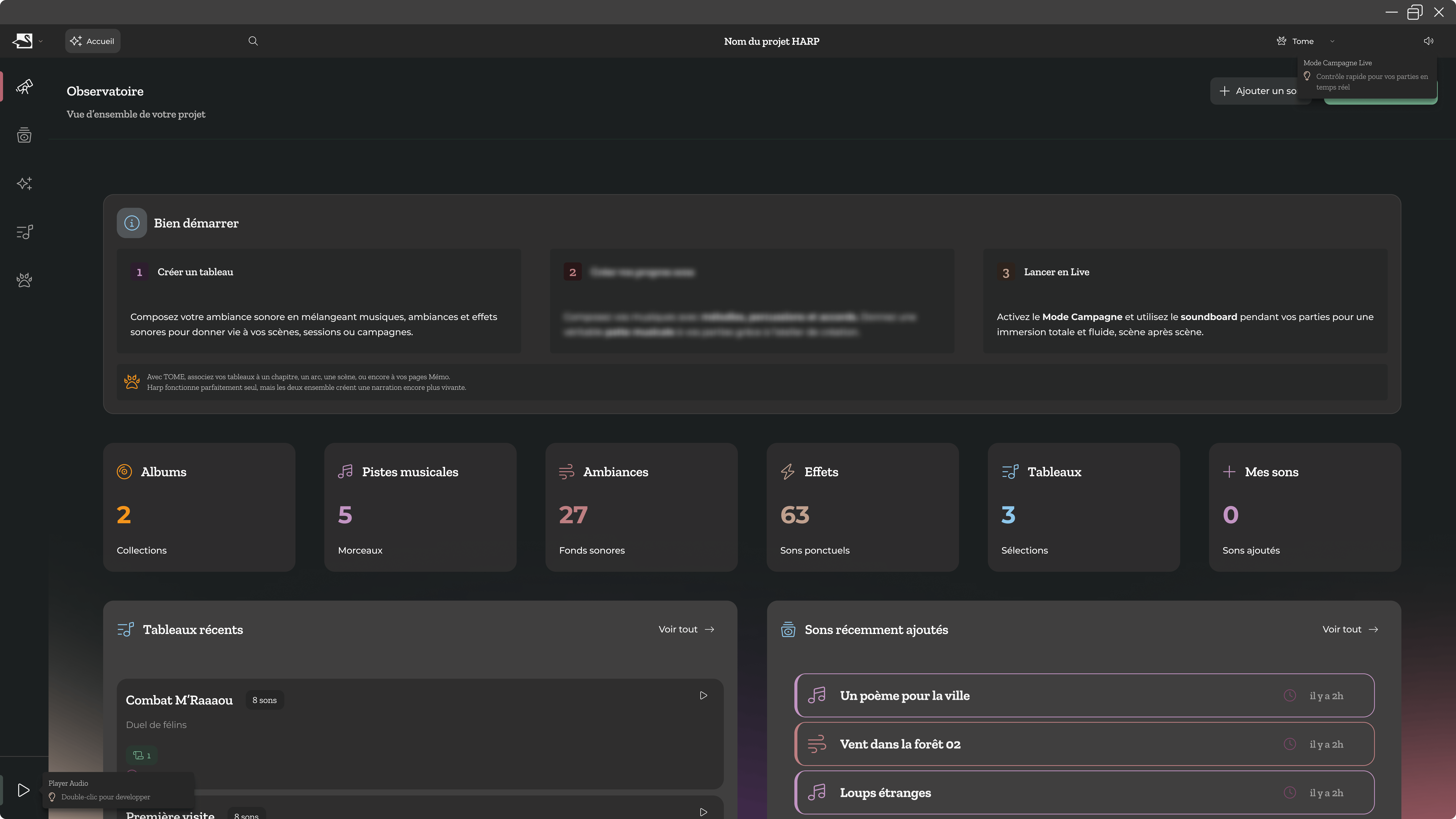 Ceci étant dit, Harp peut être relié à Tome durant vos campagnes, vous permettant de préparer et de déclencher facilement les éléments sonores prévus directement depuis Tome, sans avoir besoin de jongler entre les applications, et vous consacrer pleinement à votre narration, à vos joueurs et au moment privilégié que vous partagez tous ensemble.