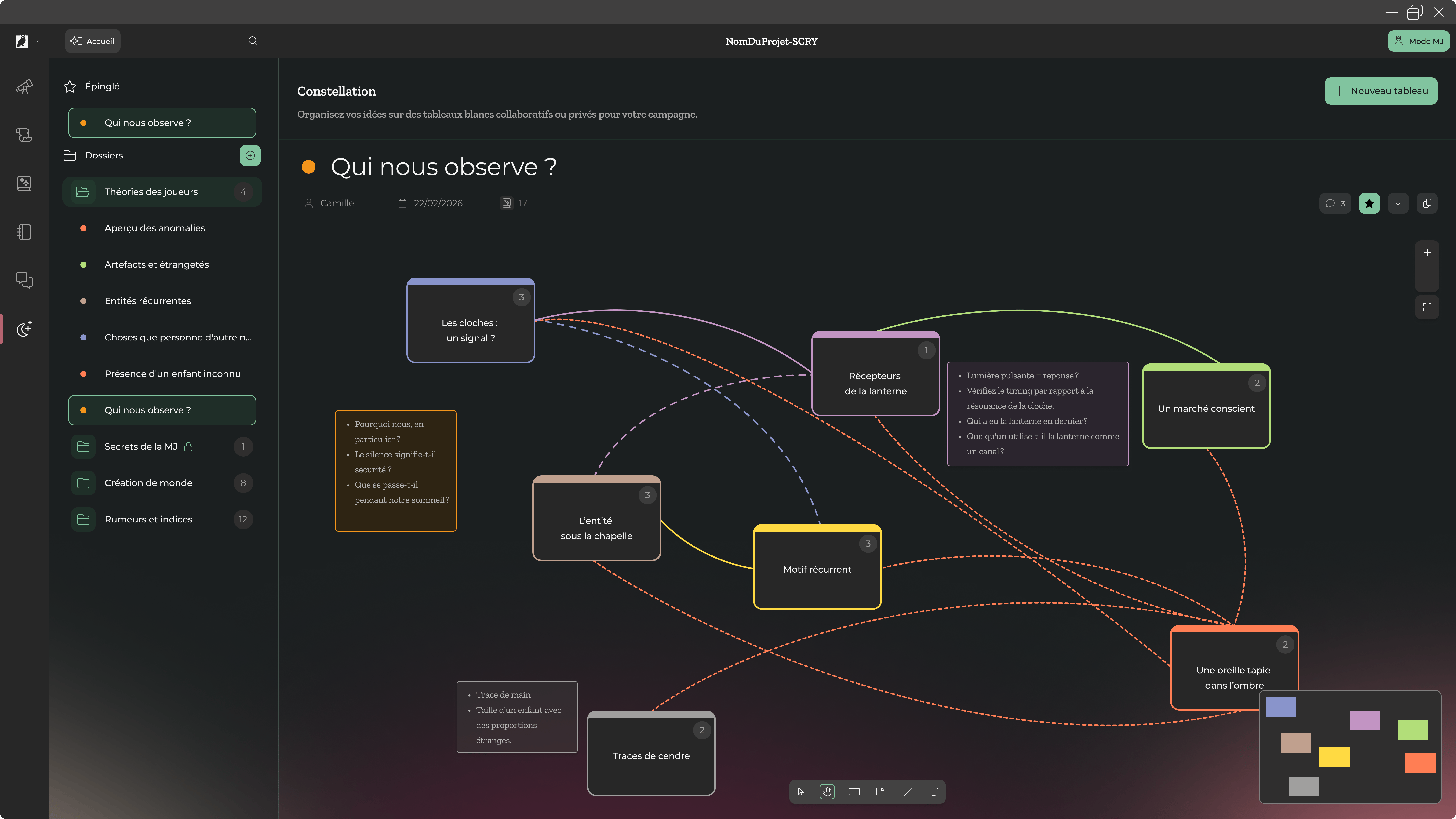 Avec Scry, vous pouvez facilement placer tout ce que vous avez écrit ou reçu d’un autre joueur dans une carte mentale, et tenter de comprendre l’univers, ses règles et ses mystères. Reliez visuellement les concepts et profitez de l’utilisation habituelle des couleurs dans la Suite pour saisir l’essentiel d’un simple coup d’œil.