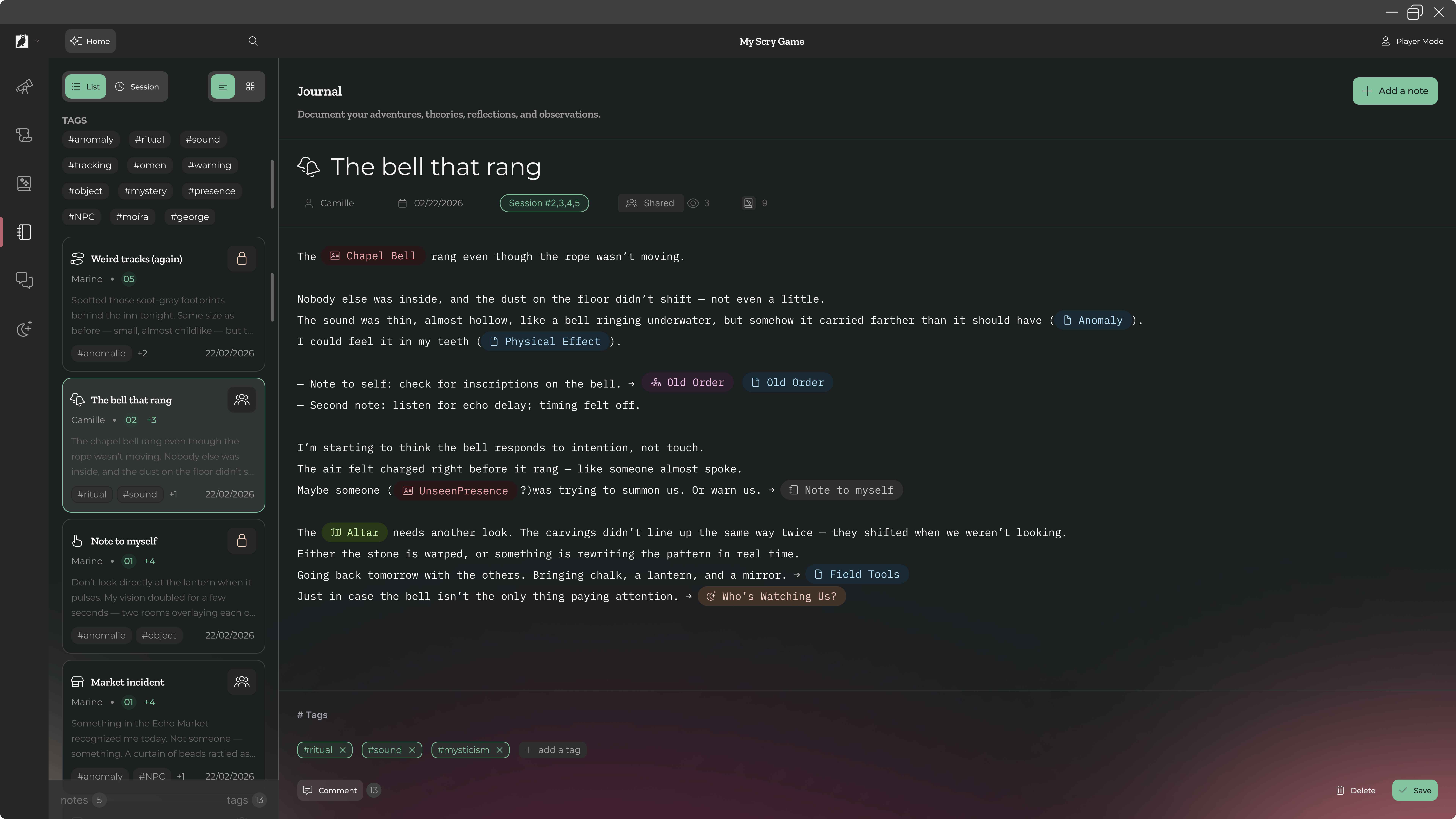 We are planning many things for this type of interacting, both during and in-between sessions. With Scry, even the most complex investigation campaigns, with gameplay spanning over a year, can be kept track of by everyone.