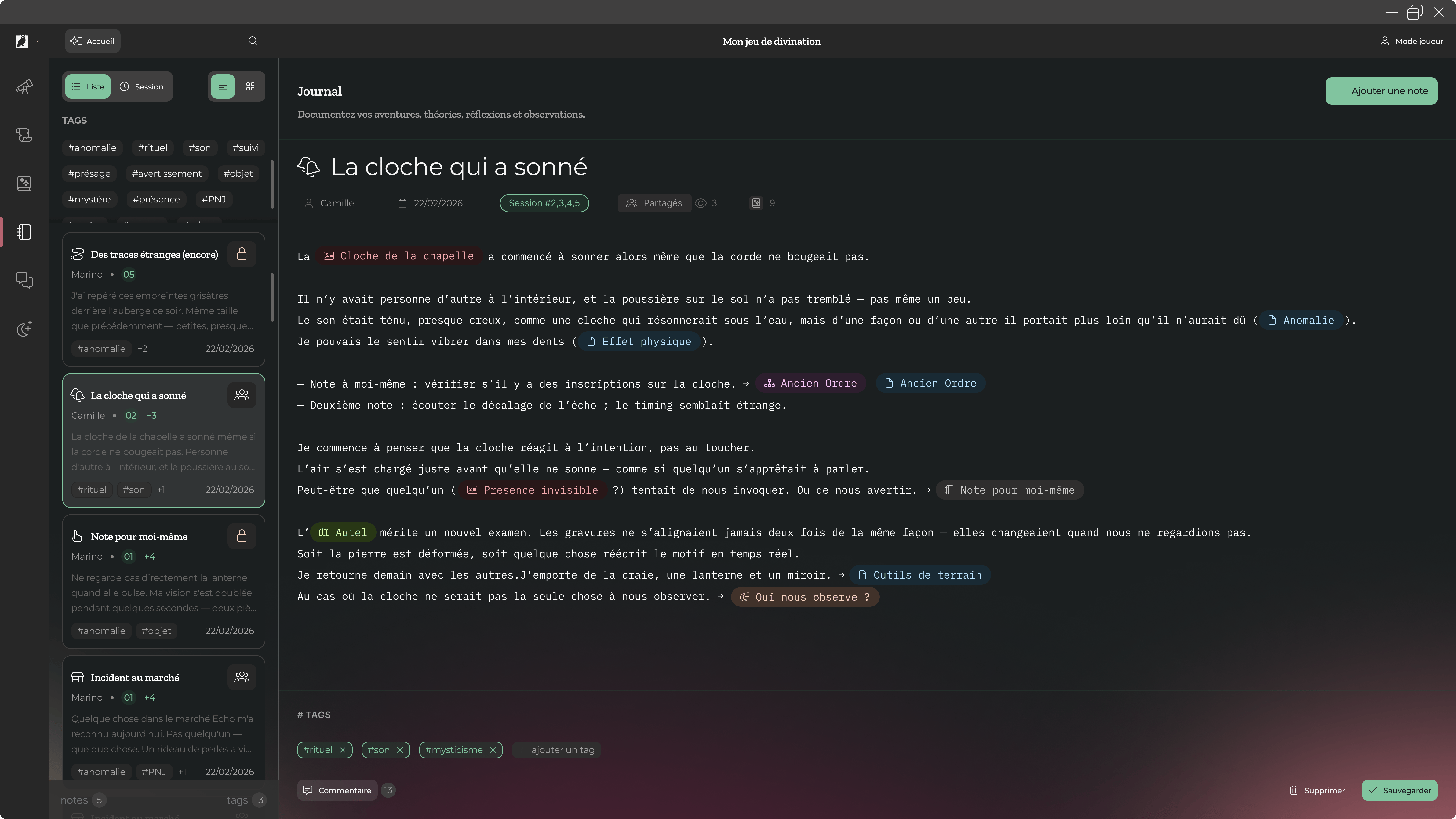 Le MJ peut lui aussi tenir son propre journal, et s’appuyer sur les informations que les joueurs ont choisi de partager pour préparer des sessions superlatives… tout en suivant les théories parfois farfelues qu’ils auront imaginées autour de l’intrigue principale.