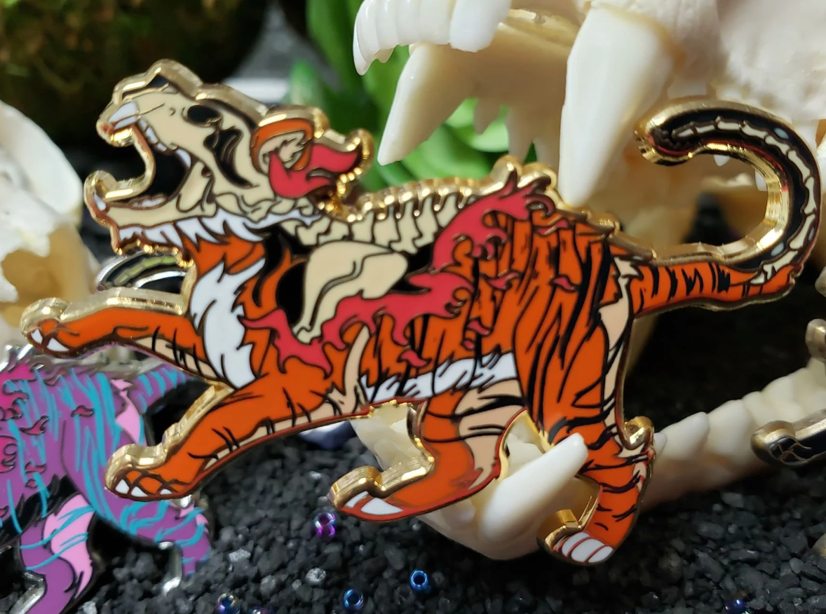 That first tier unlocks two pins, the undead and living versions of the Sumatran Tiger; while offering variants of the set of mini byte pins from the last campaign. I choose the tiger over the raptor to head this project because the tiger pin was the first ever design I did for Disappear as well as the first plushie I designed. It feels like such a long time ago now!