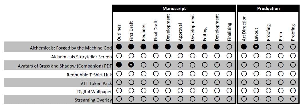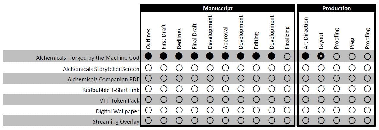 Our main reward, the Alchemicals book, has joined the Layout queue! If we get lucky, there may be some artwork sneak out while the team is marrying the graphic design, interior illustrations, and text. If anything comes my way, I'll be sure to include it in future updates. That's also usually a pretty good indication of when we're getting closer to a backer PDF, so stay tuned!