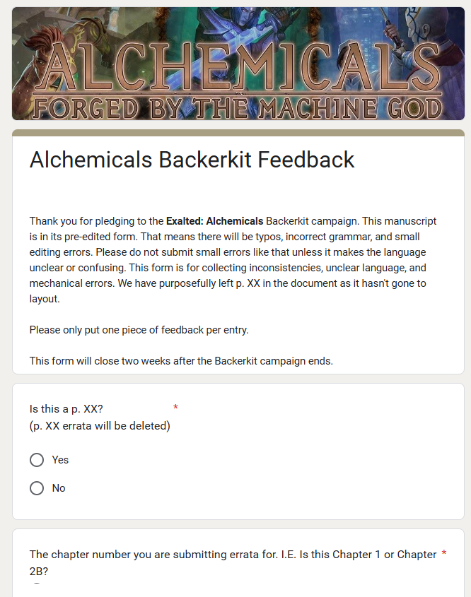 That means you'll know exactly what you're getting in to, but more importantly it means you'll be able to help out the development team by guiding the book through the next stages of editing and development! The Onyx Path team has set up a special Feedback Form just for campaign backers for this very purpose: https://forms.gle/TNemGoMirkKR4h8U6