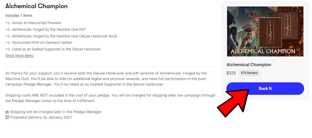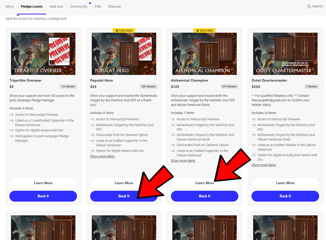Clicking "Learn More" expands the Pledge Level info. For example, clicking "Learn More" on the Alchemical Champion tier gives you...