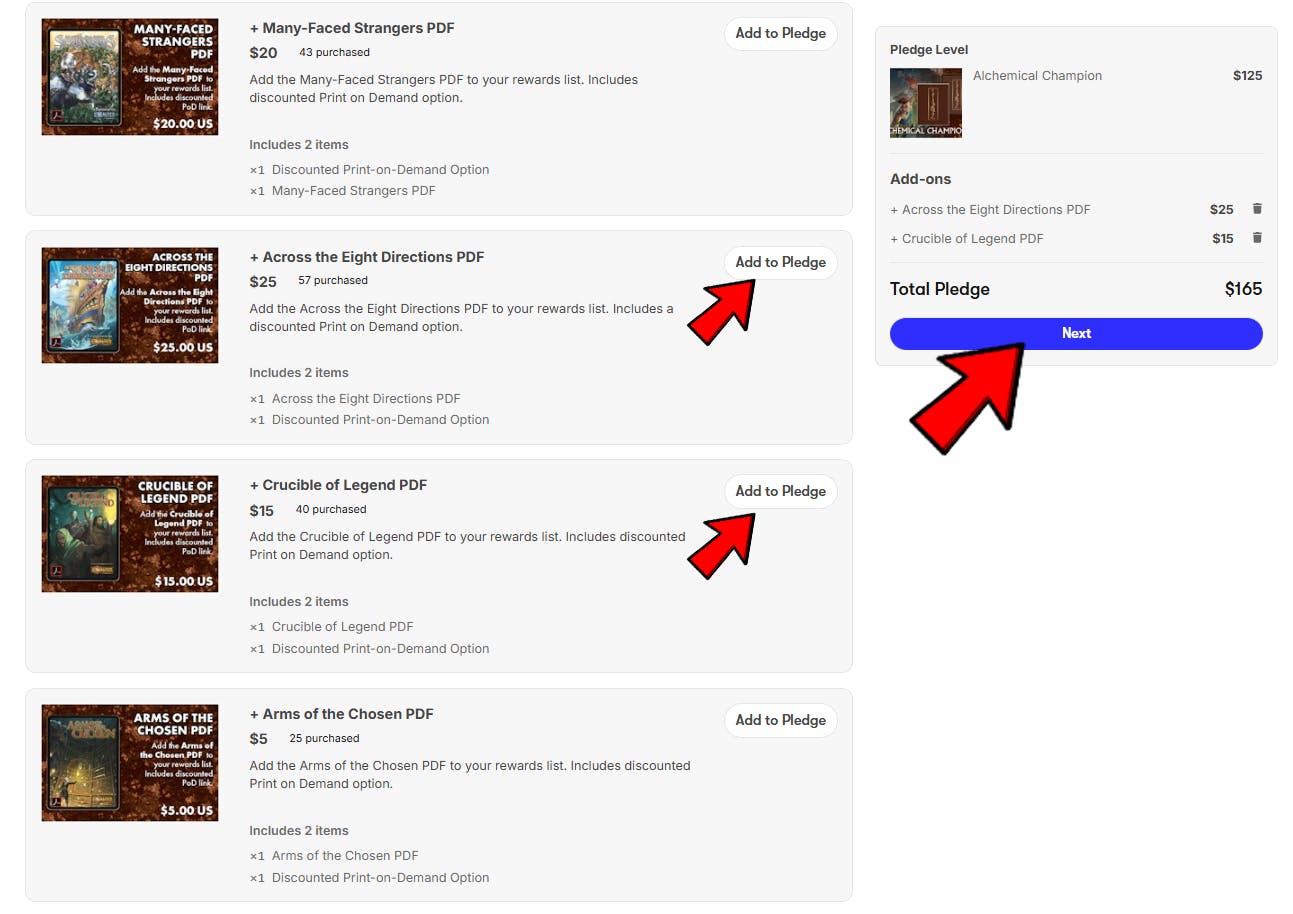 For example, I've decided on the $125 Deluxe Hardcover pledge, so I select BACK IT for that tier, and then I want to add on aa few of the optional Add On extras to my rewards list. I'm going to add the PDFs for Across the Eight Directions and Crucible of Legend, two titles that weren't part of previous crowdfunding campaigns and I need for my Exalted library.