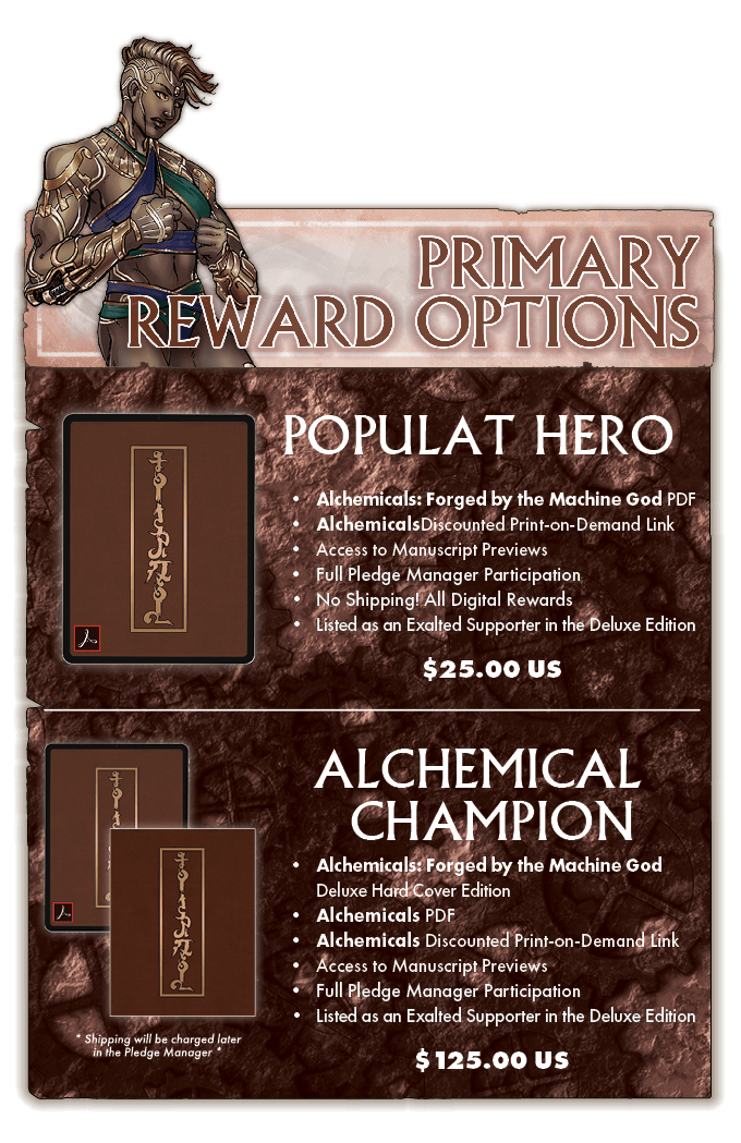 The two main Pledges focusing on ALCHEMICALS are the $25 Populat Hero for PDF only rewards, and the $125 Alchemical Champion tier for the deluxe hardcover book, all in all pretty self-explanatory.
