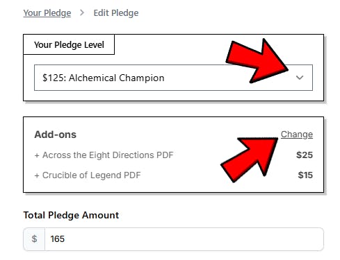 My total is $165.00 USD. That's $125 for my Alcehmical Champion pledge tier, +$25 for the Across the Eight Directions PDF +$15 for the Crucible of Legend PDF