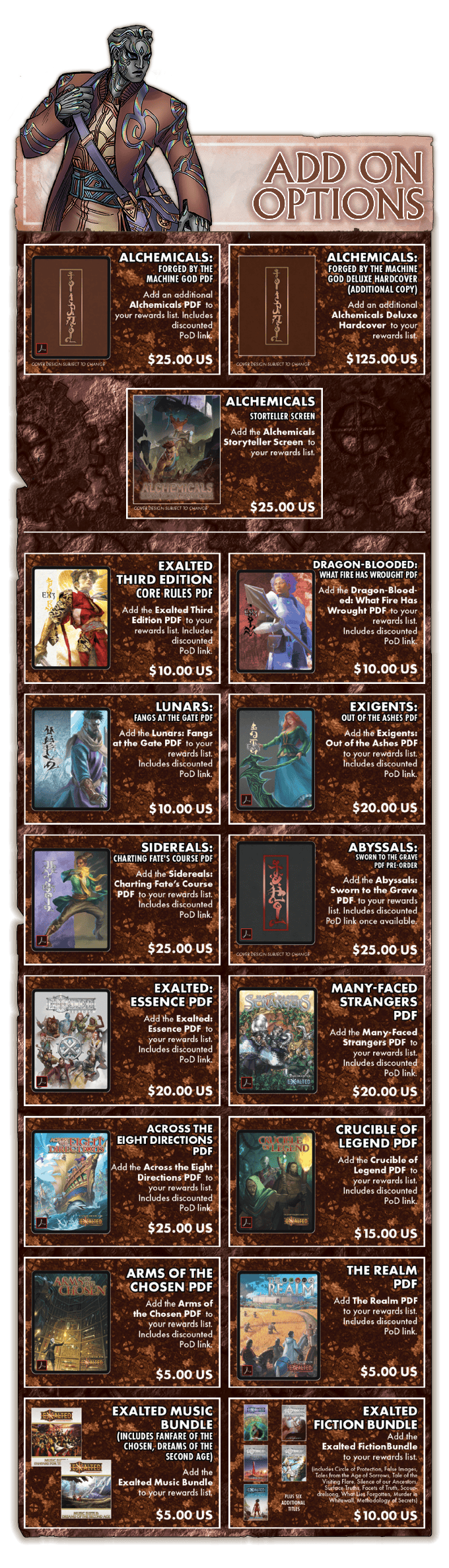 We also have two reward bundles. The Exalted Music Bundle includes Fanfare of the Chosen and Dreams of the Second Age, and the Exalted Fiction Bundle includes ELEVEN epic tales of the Exalted.