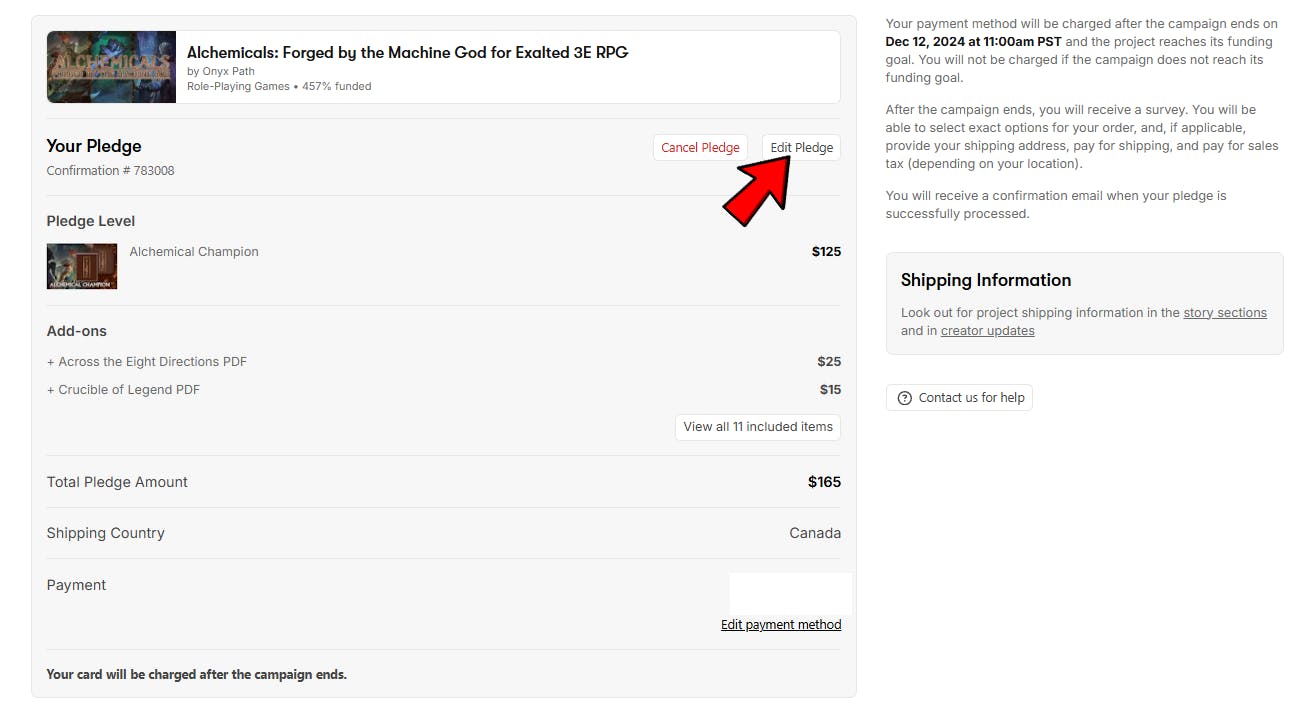 And with that, my pledge level and Add On options are set for your pledge. At this time, you don't need to worry about setting shipping information.