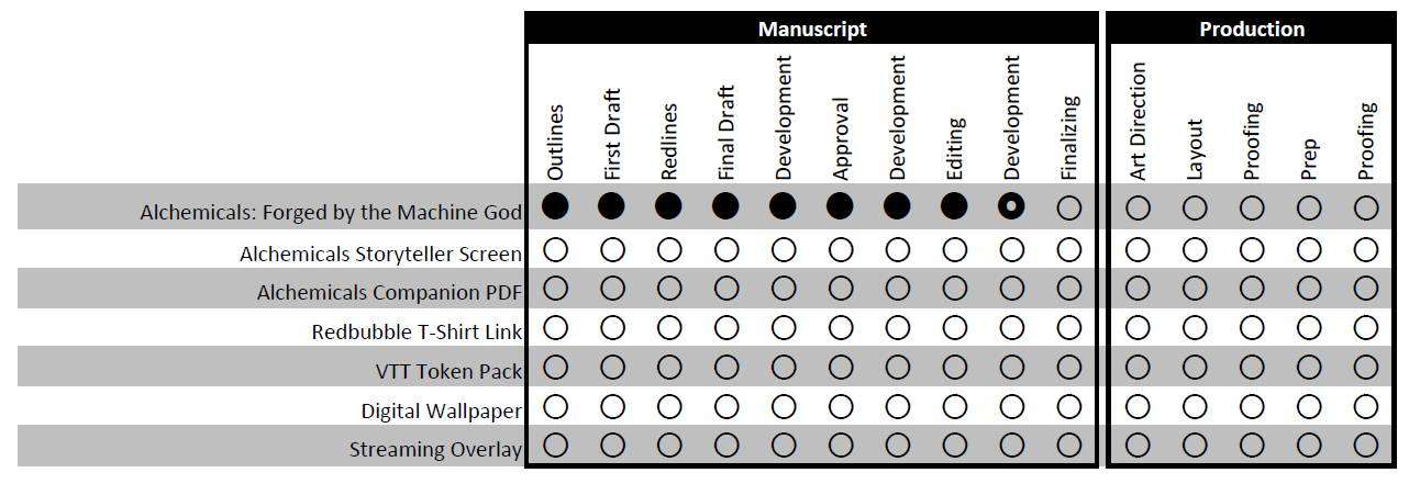 Our Alchemicals manuscript has moved to post-Editing development, with the team putting the final touches on the manuscript using the feedback you provided during the campaign as their guide posts.