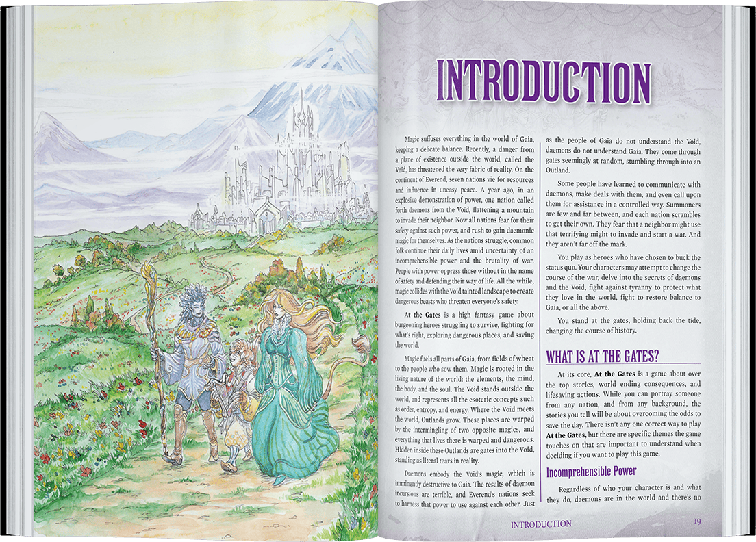 At the Gates is a high fantasy tabletop roleplaying game about burgeoning heroes struggling to survive, fighting for what’s right, exploring dangerous places, and saving the world.
