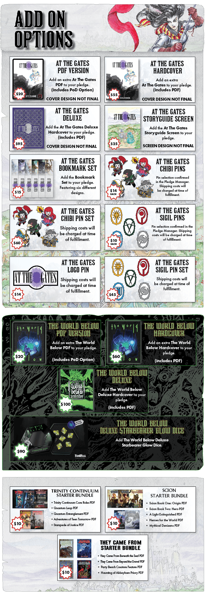 In addition to the rewards listed in each Pledge Level, backers can add extra options via the Add On menu associated with your reward format. Digital Rewards can be added to any pledge, while physical rewards can only be added to rewards lists that include a version of At The Gates hardcover book, and will therefore have a shippable order when information is downloaded in the fulfillment system.