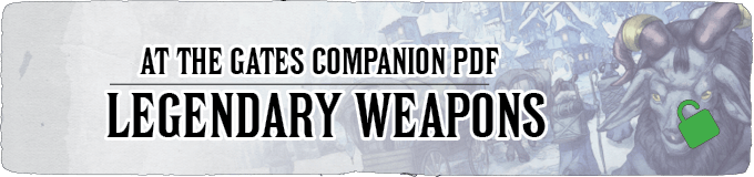 ACHIEVED! -At $65,000 in Funding - AT THE GATES Companion - Legendary Weapons - The concept of Legendary Weapons will be introduced and explored in the Companion PDF, with examples and guidance to introduce your own to your game. All backers receiving the At The Gates PDF as one of their rewards will have the Companion PDF added to their rewards list as a bonus!