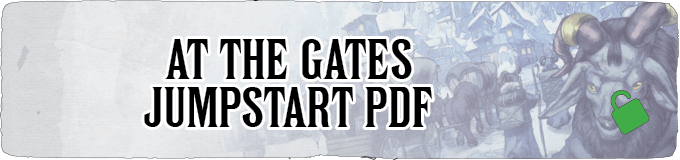 ACHIEVED! -At $55,000 in Funding - JUMPSTART PDF - An introductory scenario designed to welcome new players to the game, along with ready-made characters and a basic rules overview, will be created as a Jumpstart PDF supplement and added as a bonus to the rewards list of all backers receiving the At The Gates PDF.