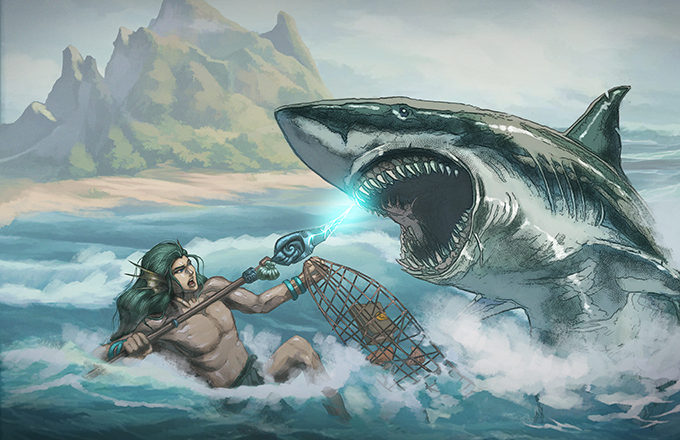 The islands’ people reflect the wondrous variety of fish, sea mammals, and birds that inhabit the archipelago. Bright plumage and sharp beaks are common sights, as are shimmering scales and translucent fins. Shark-featured pirates crew sleek, rapid ships and serpent-folk defend their sandy, stony, or thickly forested homes.