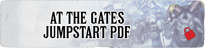 At $55,000 in Funding - JUMPSTART PDF - An introductory scenario designed to welcome new players to the game, along with ready-made characters and a basic rules overview, will be created as a Jumpstart PDF supplement and added as a bonus to the rewards list of all backers receiving the At The Gates PDF.