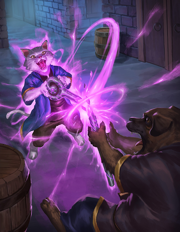 Cats can’t help but smile at the clumsy way dogs handle the arcane. Sure, they have access to the many masterworks they find in their realm, but they don’t have the same affinity for magic that cats do. They couldn’t ever absorb the magic into themselves, thus proving their inferiority to mancers. Often these dogs seem unable to hide their disappointment, and who can blame them?
